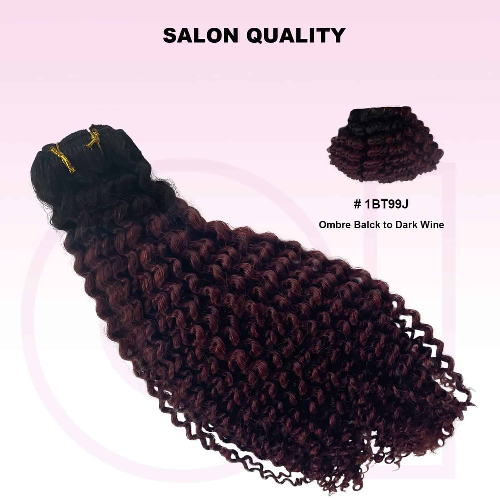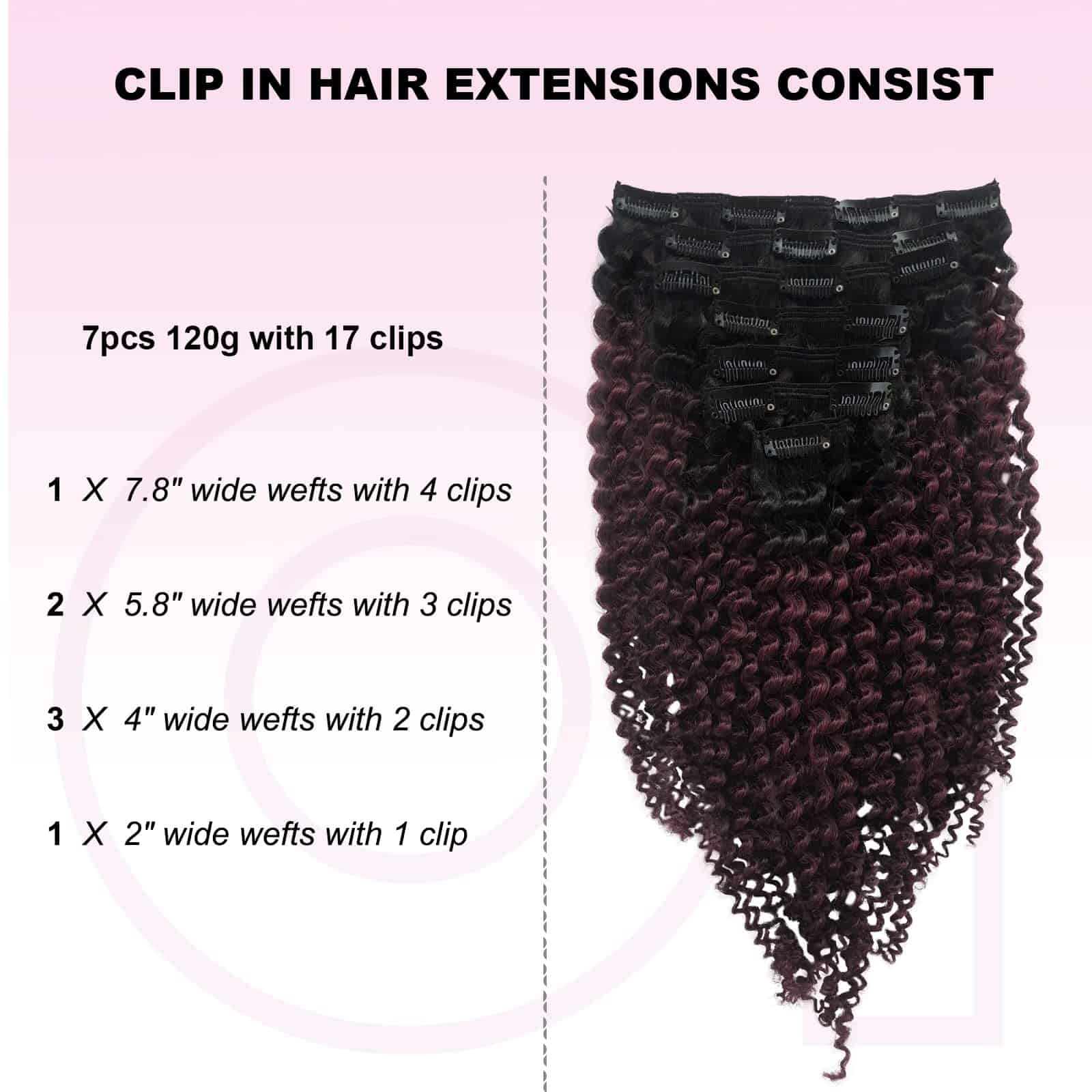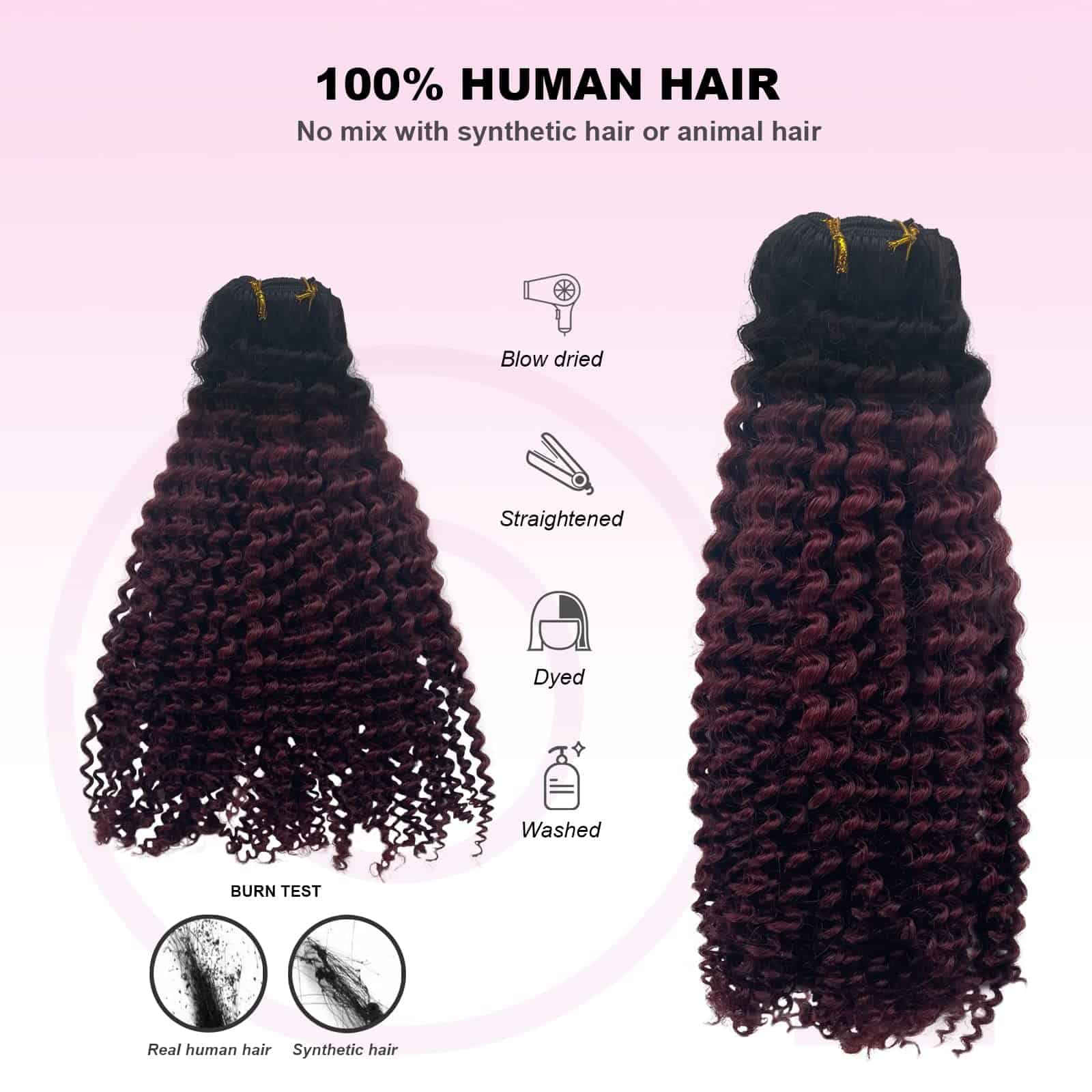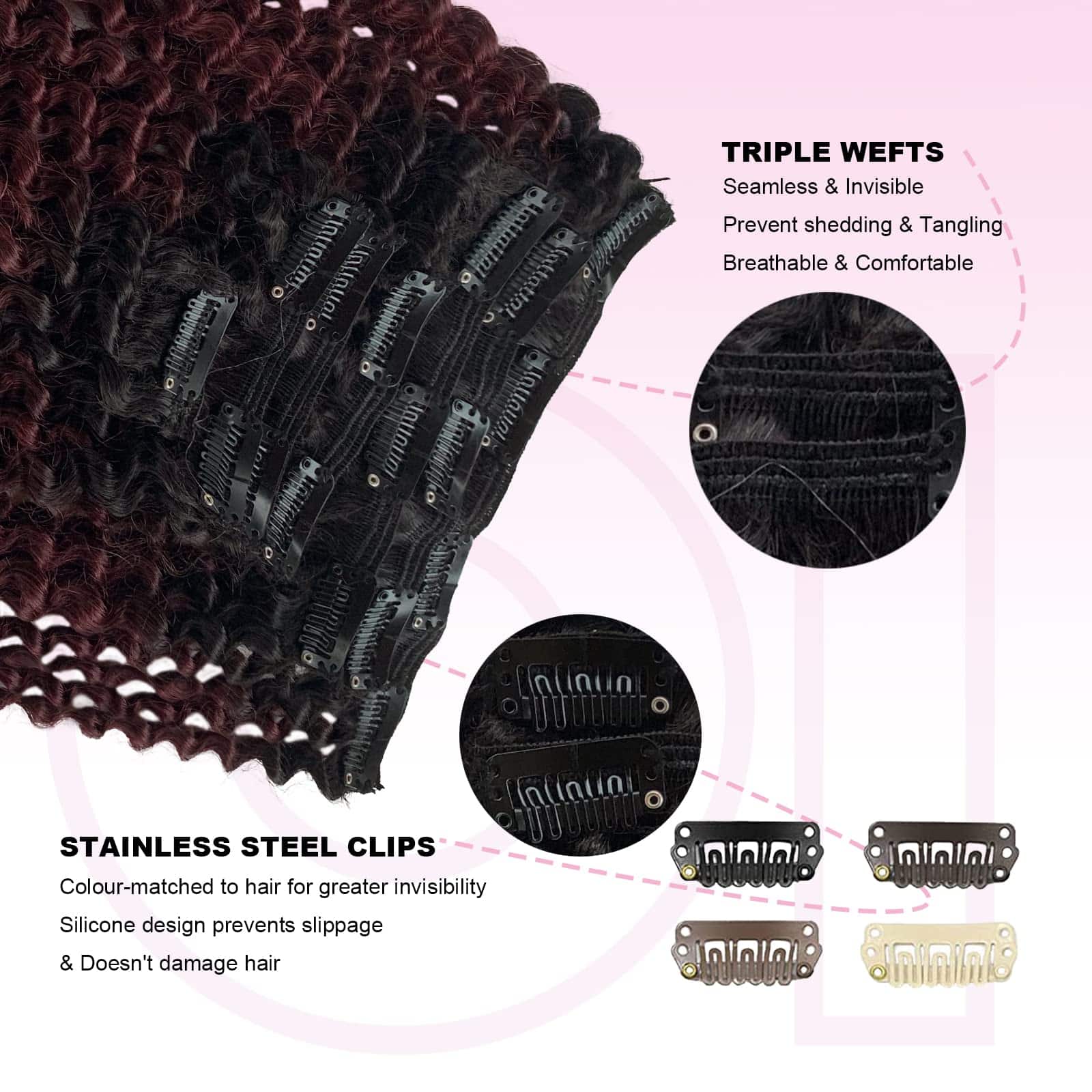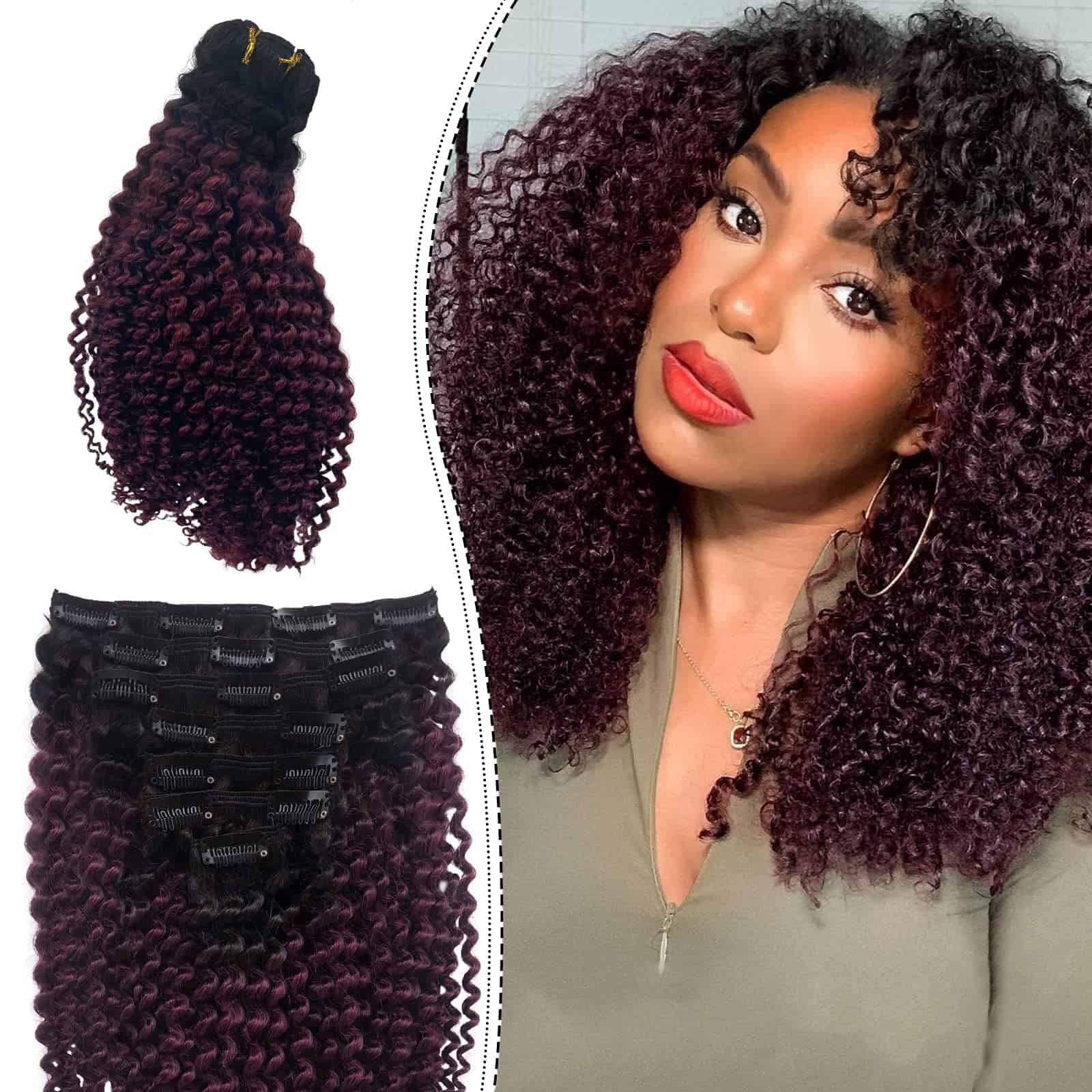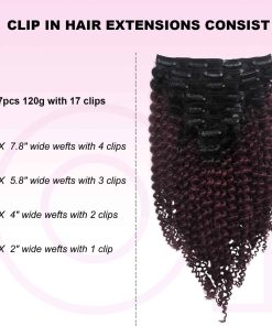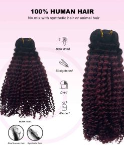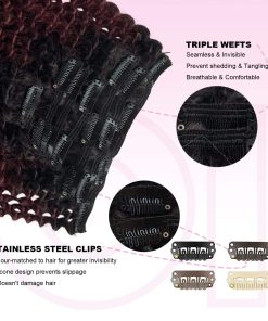 Las extensiones con clips están diseñadas con triple trama para un diseño más denso y natural. El color Ombre de #1BT99J va de negro a vino oscuro, con clips en forma de U del mismo color para un aspecto más invisible y natural. Nota: Los colores claros se pueden teñir de oscuro, pero los colores oscuros no se pueden teñir de claro. Las extensiones rizadas de cabello humano real son muy fáciles de instalar. 1. Separa el cabello con un peine o con las manos. 2. Coloca las extensiones entre las capas superior e inferior de cabello. 3. Asegura primero el clip del medio, luego los clips restantes. 4. Deja caer el cabello y estiliza. El proceso de selección de materias primas y procesamiento del cabello se realiza bajo estrictos criterios para garantizar la calidad de los productos y ofrecerte nuevas opciones de moda rápidamente. Si tienes alguna pregunta, contáctanos directamente y te proporcionaremos una solución en 24 horas. Nota: Debido a diferentes resoluciones de pantalla y luz, puede haber ligeras diferencias de color entre la imagen y el producto real. También ofrecemos servicio de combinación de colores.
