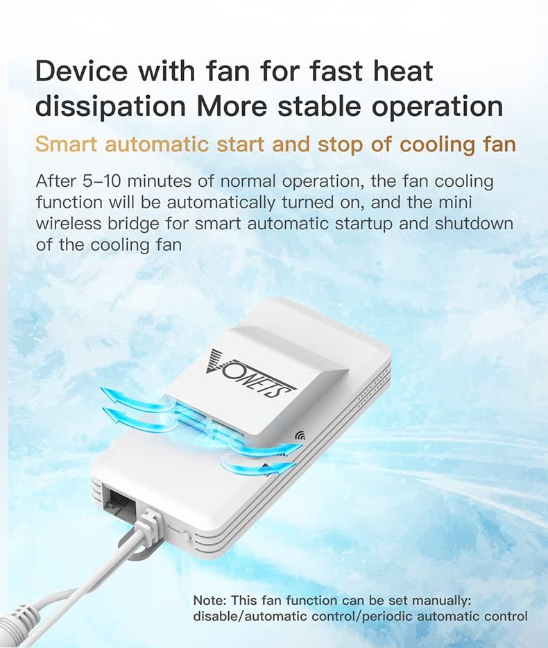 Nueva actualización: La función de ventilador de enfriamiento recién agregada puede reducir efectivamente la temperatura del extensor de WiFi, mejorando así su estabilidad y confiabilidad, y extendiendo su vida útil. Esta función es especialmente importante para los usuarios que necesitan operar el equipo durante mucho tiempo, ya que puede garantizar que el extensor de WiFi no se sobrecaliente y cause daños durante la operación continua, mejorando la experiencia del usuario.