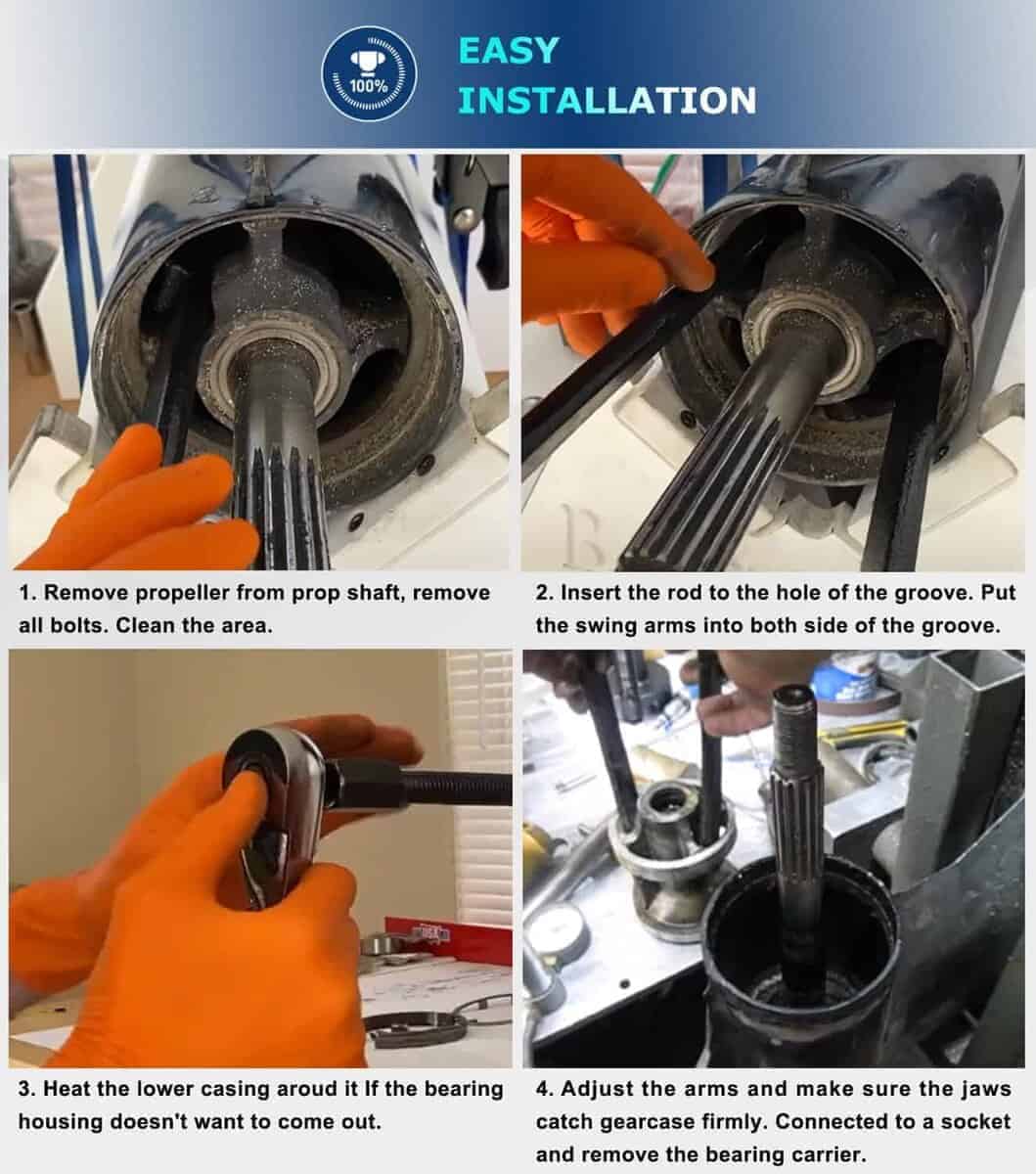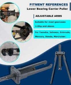 1. APLICACIÓN — Adecuado para Yamaha, Johnson, Evinrude, Mercury (NO SE AJUSTA A VERADO), Honda, Mercruiser. Este extractor de cojinetes inferiores con brazos ajustables funcionará en la mayoría de los fuerabordas de 115hp y superiores.