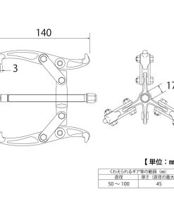 Herramienta de extracción de poleas con una fuerza de extracción promedio de 3 puntos. Polea compatible: 2.0 – 3.9 pulgadas (50 – 100 mm); Longitud de la garra: 3.9 pulgadas (100 mm); Carga admitida: 1.4 t; País de origen: Japón; Peso: 2.3 lbs (1.05 kg).
