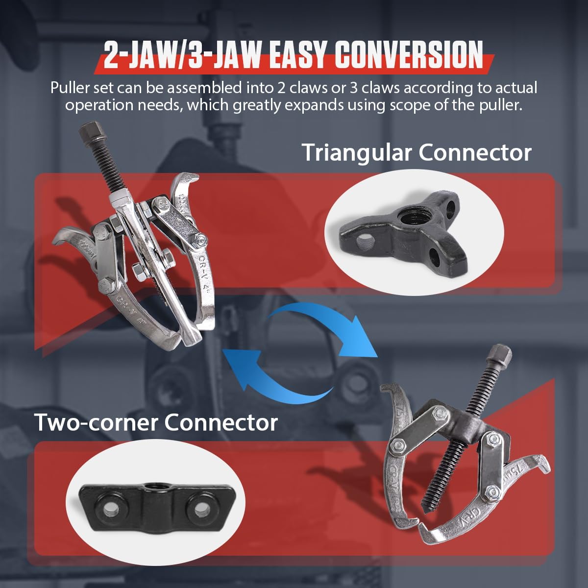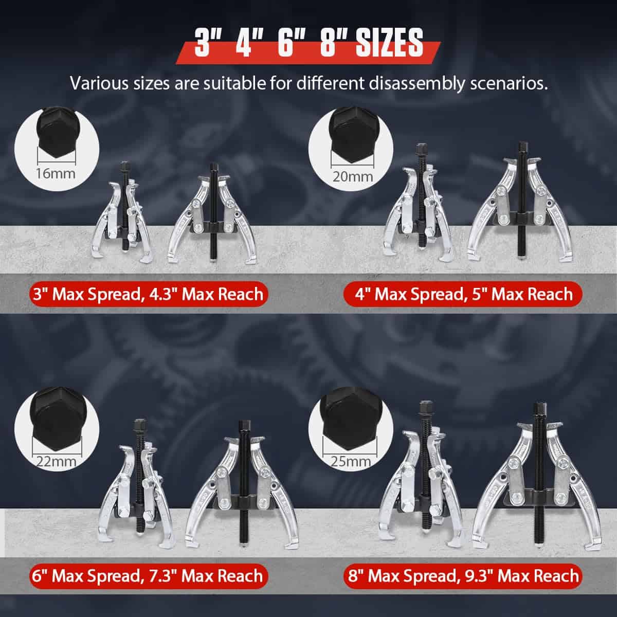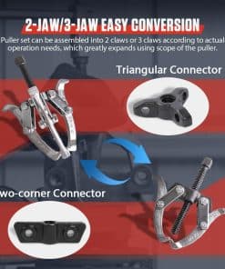 1. Convertidor Fácil de 2 Mordazas/3 Mordazas y Múltiples Tamaños: el set de extractores se puede ensamblar en 2 mordazas o 3 mordazas según las necesidades de operación reales, lo que amplía en gran medida el alcance de uso del extractor. Incluye 4 tamaños de extractores: 3″, 4″, 6″, 8″. Extractor de 3″ con un alcance máximo de 4.3″ y extensión máxima de 3″. Extractor de 4″ con un alcance máximo de 5″ y extensión máxima de 4″. Extractor de 6″ con un alcance máximo de 7.3″ y extensión máxima de 6″. Extractor de 8″ con un alcance máximo de 9.3″ y extensión máxima de 8″. Varios tamaños son adecuados para diferentes escenarios de desmontaje.