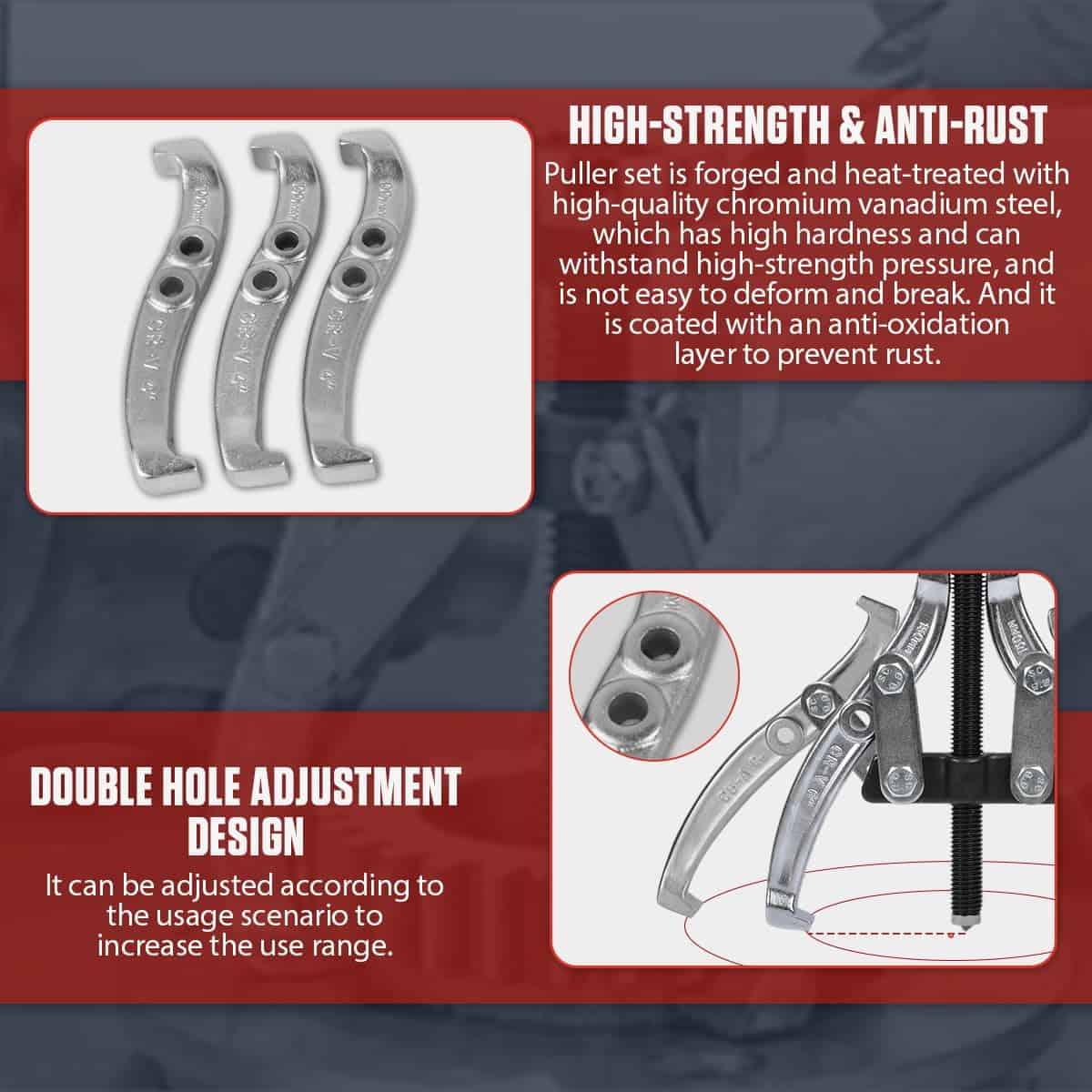 3. Set de Extractor de Engranajes de Alta Resistencia y Antioxidante: el set extractor de rodamientos está mecanizado con precisión, forjado a partir de 40CR y tratado térmicamente con acero de cromo-vanadio de alta calidad, que tiene alta dureza y puede soportar presión de alta resistencia, y no es fácil de deformar ni romper. La superficie del extractor de rodamientos externos e internos está galvanizada para aumentar la resistencia a la corrosión, y está recubierta con una capa antioxidante para evitar la oxidación, proporcionándole una vida útil más larga.