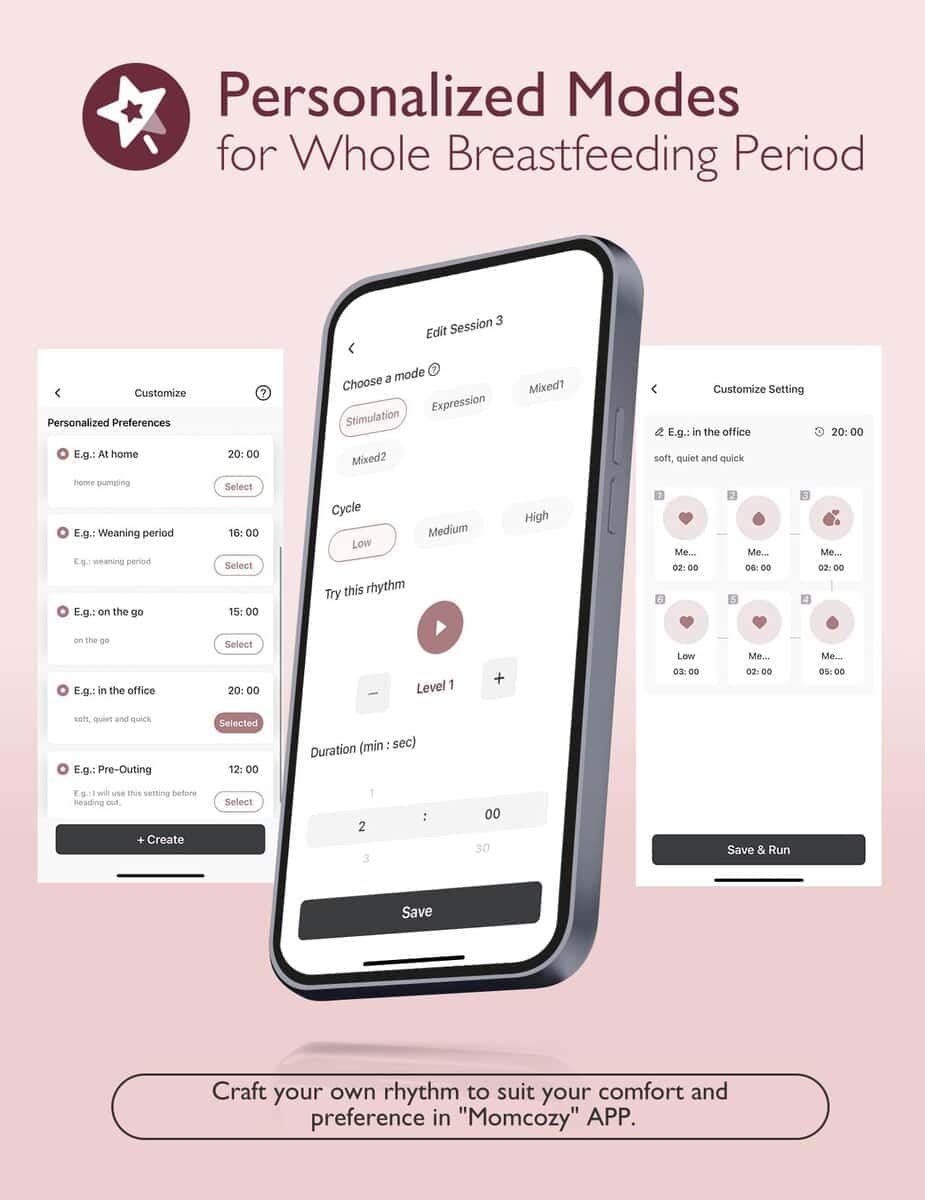 Selecciona entre 3 modos regulares (Estimulación + Expresión + Mixto) en el motor del extractor. También puedes experimentar los Modos Personalizados y 2 Modos Especiales (Alivio de Leche + Impulso de Leche) desde tu teléfono. Diseña tu ritmo para adaptarse a tu comodidad y preferencia. ¡Siempre encontrarás tu modo óptimo!