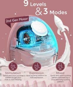 Con un rítmo ideal que aumenta la producción de leche, un potente motor de 2da generación con 3 modos y 9 niveles ajustables, y copas DoubleFit que brindan máximo confort, el extractor de leche de Momcozy garantiza una experiencia de extracción cómoda y eficiente.