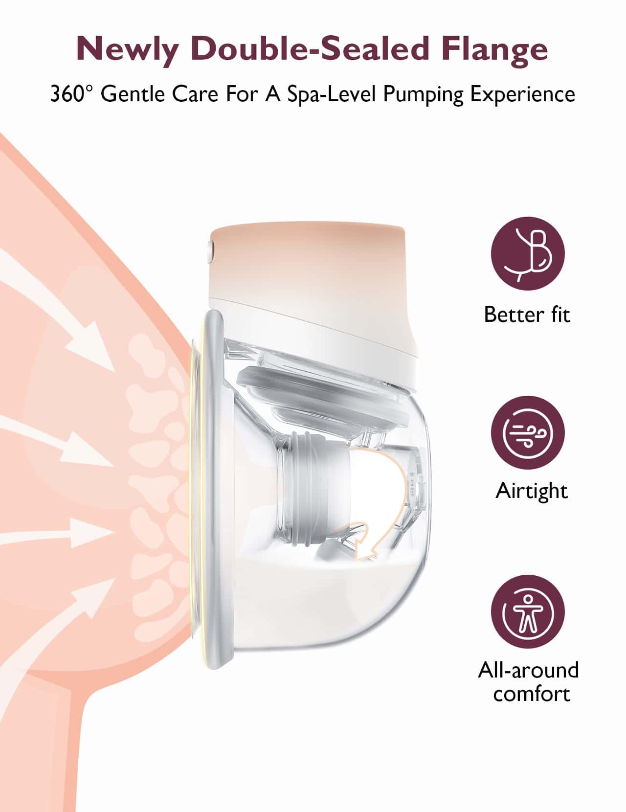 Tan suave como los labios de un bebé, tan recolector como la boca de un bebé, nuestro extractor de leche portátil S12 Pro tiene un diseño de brida doble mejorado en comparación con los normales de brida simple, que puede ajustarse más apretado y cerca de sus senos para no solo extraer más cómodamente sino también prevenir eficazmente las fugas de leche.