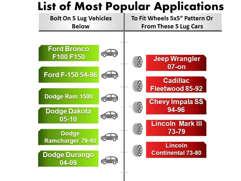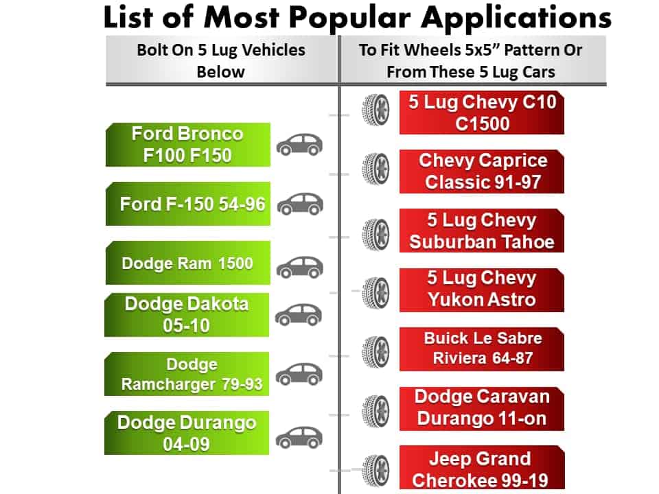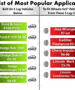 Información del Producto: El juego de adaptadores de rueda se utiliza para convertir el patrón de pernos de cubo de 5 lug 5.5 pulgadas (139.7 mm) para adaptarse a llantas de patrón de pernos de 5 lug 5 pulgadas (127 mm). También espaciarán sus ruedas en 1.5 pulgadas para ayudarle a obtener suficiente espacio para neumáticos y llantas más anchos. Mecanizado CNC con una mano de obra de precisión utilizando billet de calidad aeroespacial 6061 T6, con características de alta capacidad de carga y resistencia a la corrosión. Los pernos de alta calidad están preinstalados y se incluyen tuercas de montaje de extremo abierto con tamaño de rosca 1/2″-20. Se venden en pares para 2 ruedas. Ordene 2 pares para las 4 ruedas.