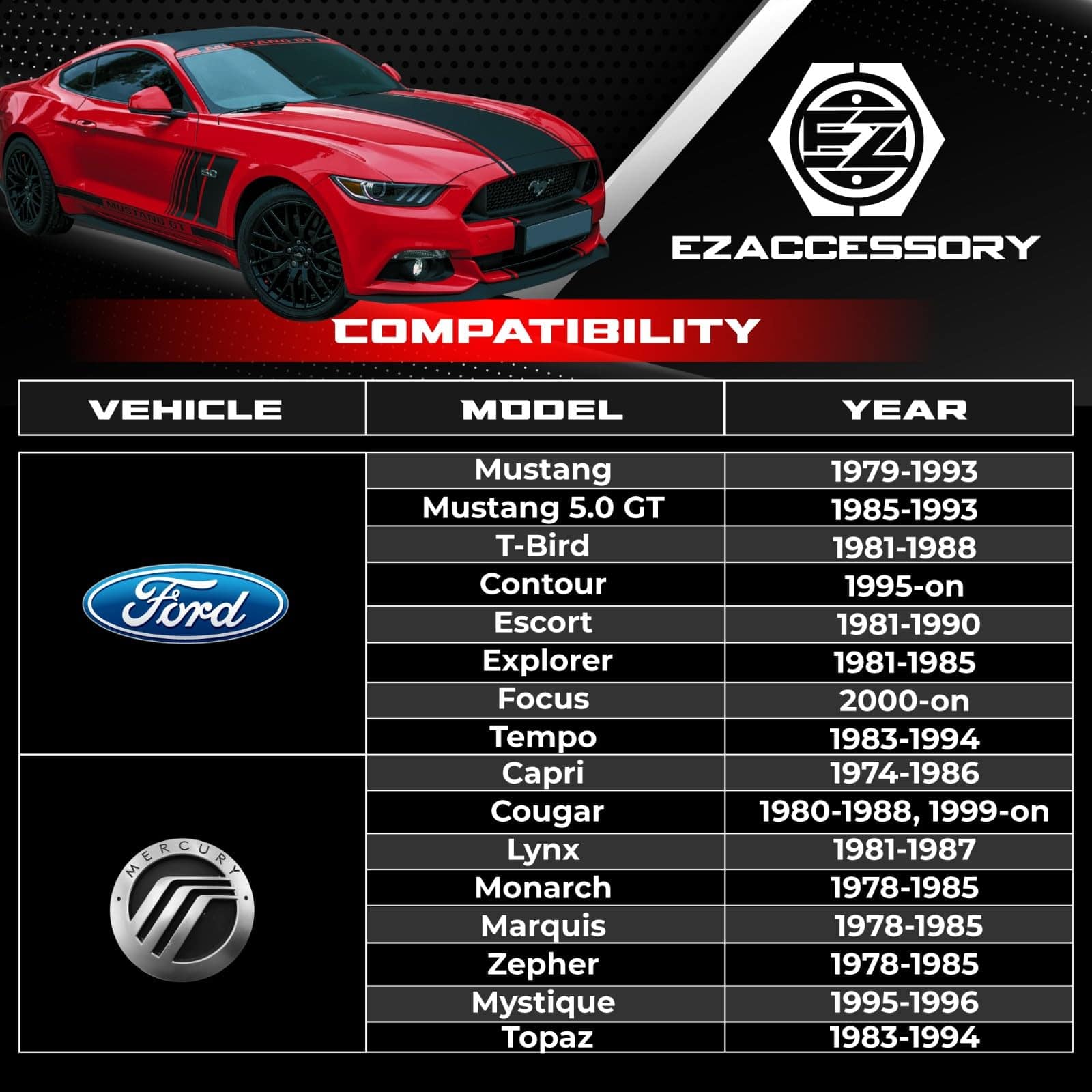 Información del Producto: El juego de adaptadores de ruedas se utiliza en bujes de patrón de pernos de 4 pernos a 4.25 pulgadas (108mm) para adaptarse a ruedas de patrón de pernos de 4 pernos a 4.25 pulgadas (108mm). Espaciará sus ruedas 1 pulgada para ayudar a obtener suficiente espacio para neumáticos y llantas más anchas. Mecanizado CNC con artesanía de precisión utilizando billet de calidad aeronáutica 6061 T6, con capacidad de carga y resistencia a la corrosión. Los pernos de alta calidad están preinstalados y las tuercas de montaje incluidas son de tamaño abierto de 12×1.5. Se venden en pares para 2 ruedas. Ordene 2 pares para las 4 ruedas. Ajuste para Vehículos: Ford Mustang 1979-1993 Ford Mustang 5.0 GT 1985-1993 T-Bird de Ford 1981-1988 Ford Contour 1995 en adelante Ford Escort 1981-1990 Ford Exp 1981-1985 Ford Focus 2000 en adelante Ford Tempo 1983-1994 Capri de Mercury 1974-1986 Mercury Cougar 1980-1988, 1999 en adelante Lynx de Mercury 1981-1987 Monarca, Marquis, Zepher de Mercury 1978-1985 Mystique de Mercury 1995-1996 Topaz de Mercury 1983-1994 Especificación del Adaptador: Patrón de Pernos del Vehículo: 4×4.25″ (4x108mm) Patrón de Pernos de la Rueda: 4×4.25″ (4x108mm) Tamaño del Perno de los Pernos: M12x1.5 Tamaño del Buje: 78mm Grosor: 1 pulgada (25mm) Torque: 80 lb-pie Notas Técnicas: Si los pernos del buje sobresalen del adaptador y evitan que las ruedas se sitúen correctamente, es necesario acortar los pernos de fábrica.