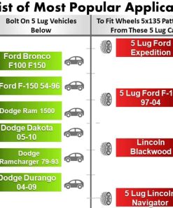 El juego de adaptadores de rueda se utiliza para convertir el patrón de pernos del cubo de 5 lug 5.5 pulgadas (139.7mm) para ajustar ruedas de patrón de pernos de 5 lug 135mm. También espaciarán tus ruedas por 1.5 pulgadas para ayudarte a obtener suficiente espacio para neumáticos y llantas más anchas. Mecanizado CNC con artesanía de precisión utilizando billet de calidad aeroespacial 6061 T6, caracterizado por su alta capacidad de carga y resistencia a la corrosión. Los pernos de alta calidad vienen preinstalados y se incluyen tuercas de montaje de extremo abierto de 1/2″-20. Se venden en pares para 2 ruedas. Ordena 2 pares para las 4 ruedas.