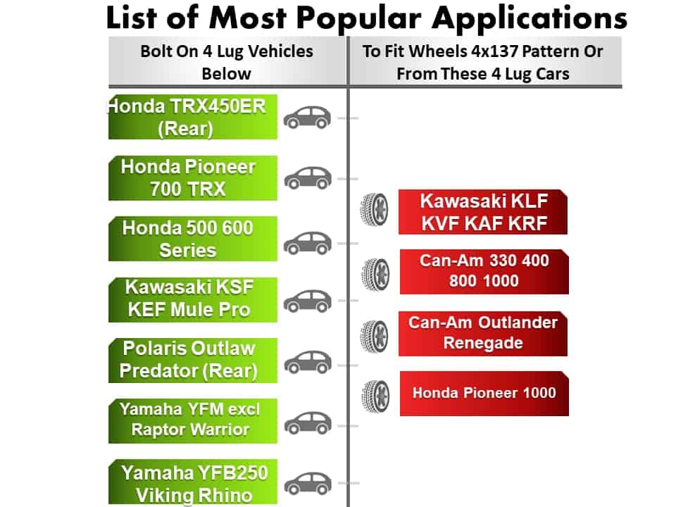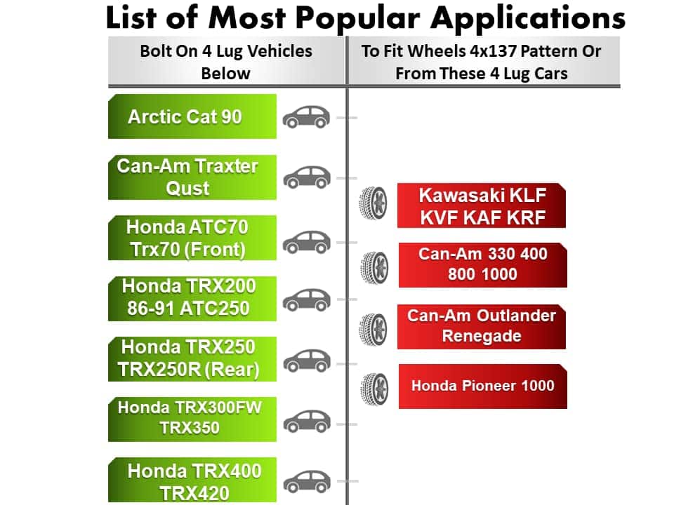 El juego de adaptadores de rueda se utiliza en bujes de 4 pernos ATV con patrón de pernos de 110mm para adaptarse a ruedas de 137mm con patrón de pernos de 4 pernos. Aumentarán el espacio de sus ruedas en 1.5 pulgadas para ayudarlo a obtener suficiente espacio para neumáticos y llantas más anchas. Mecanizado CNC con artesanía de precisión utilizando billetes de calidad aeroespacial 6061 T6, con características de alta capacidad de carga y resistencia a la corrosión. Los pernos de alta calidad están preinstalados y se incluyen tuercas de montaje de extremo abierto de 10×1.25. Se venden como un conjunto para 4 ruedas. Ordene 1 juego para las 4 ruedas.