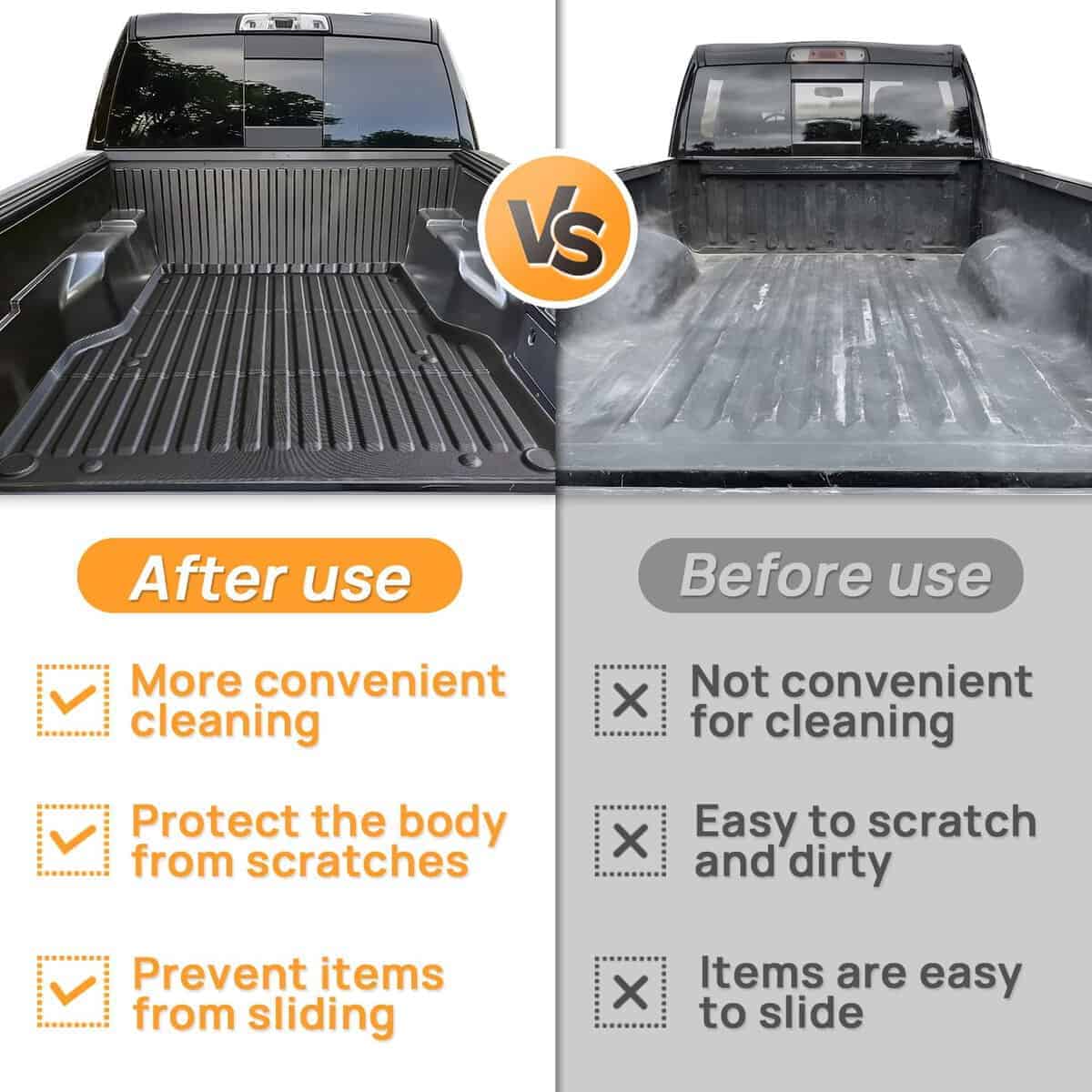 4. Fácil de instalar: Rápido y sin esfuerzo, simplemente coloque el tapete en la cama de su camión sin necesidad de herramientas.