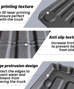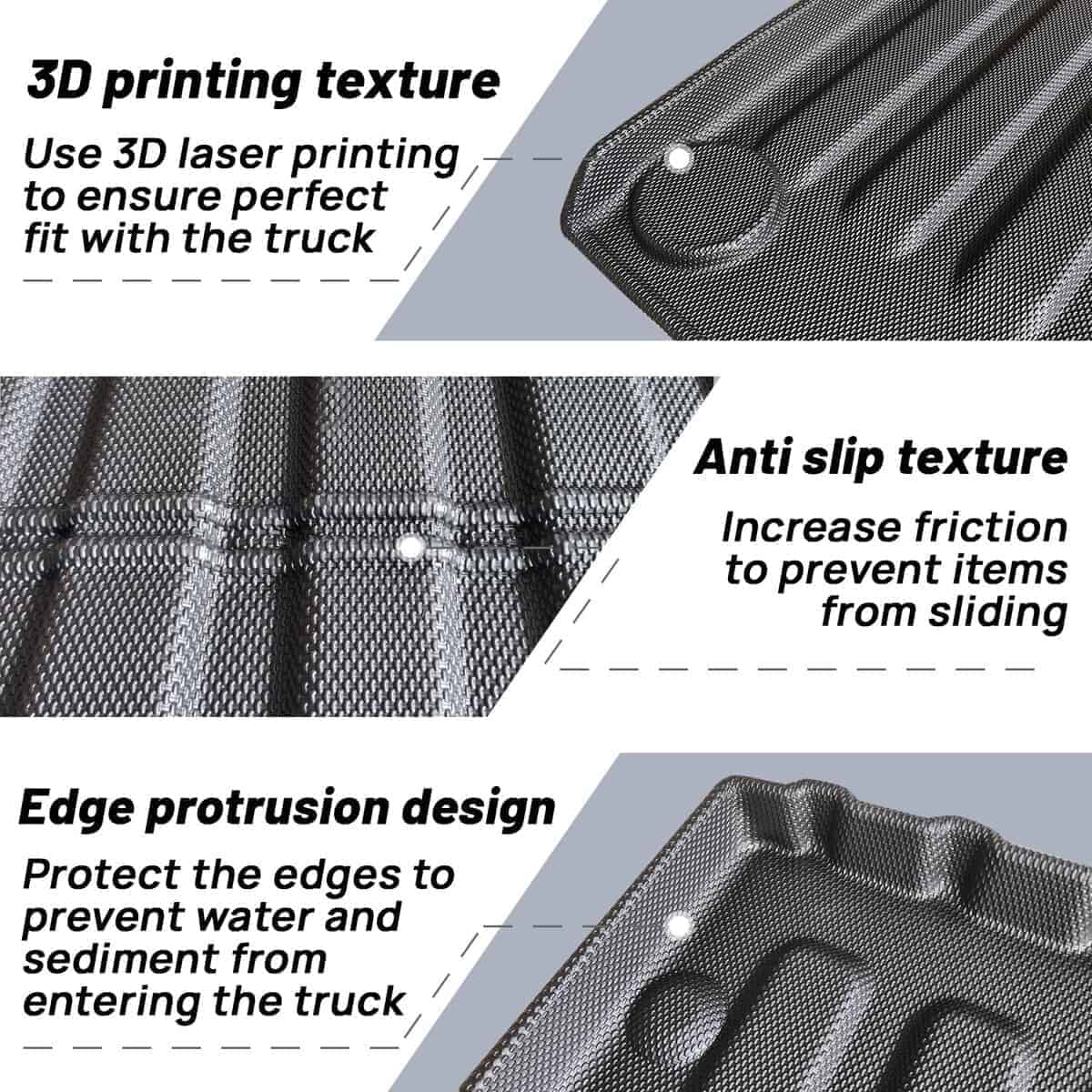 2. Función: Los bordes elevados evitan derrames y bloquean el agua y la suciedad, manteniendo limpia la cama de tu camión. La superficie texturizada ofrece agarre para evitar que la carga se desplace y cause daños.