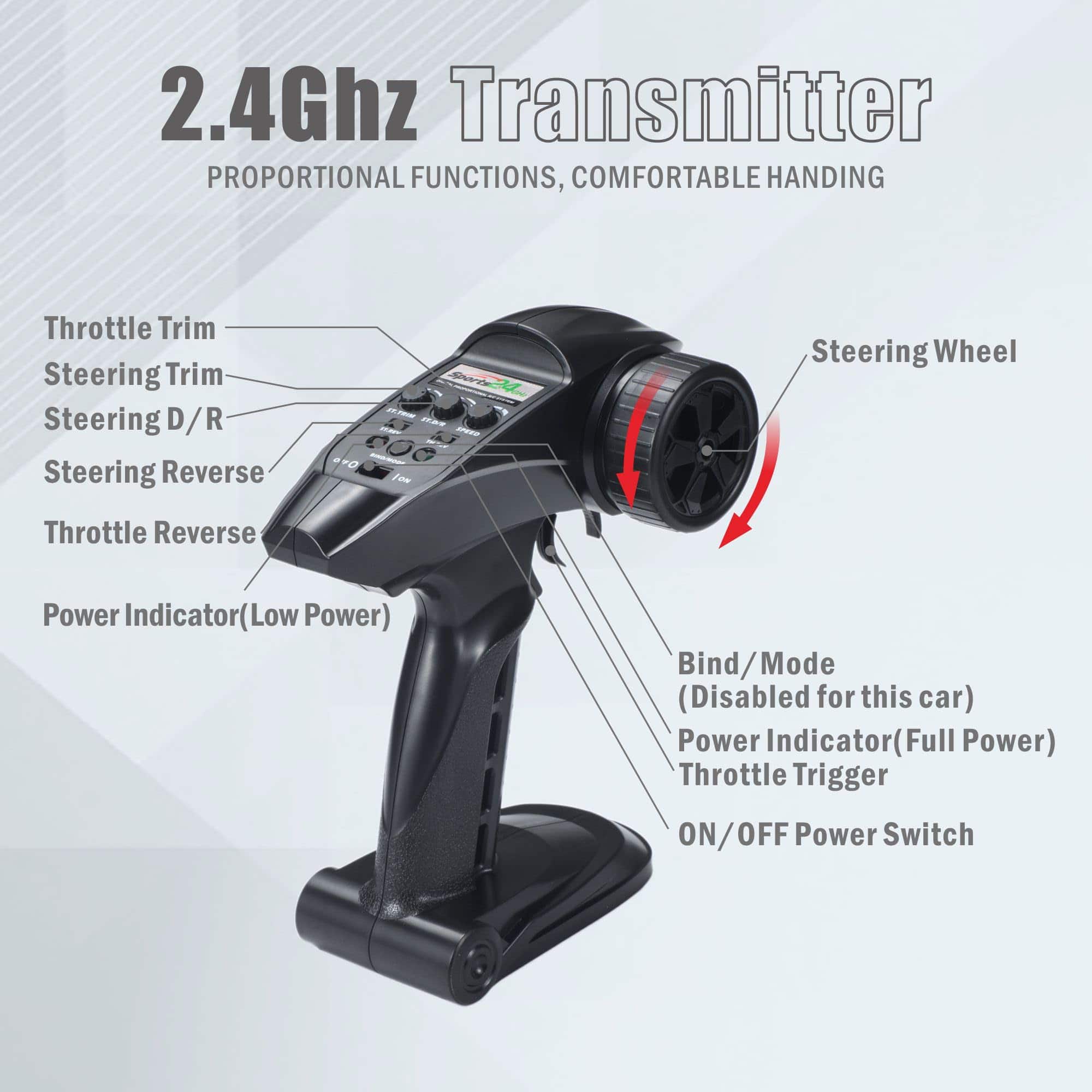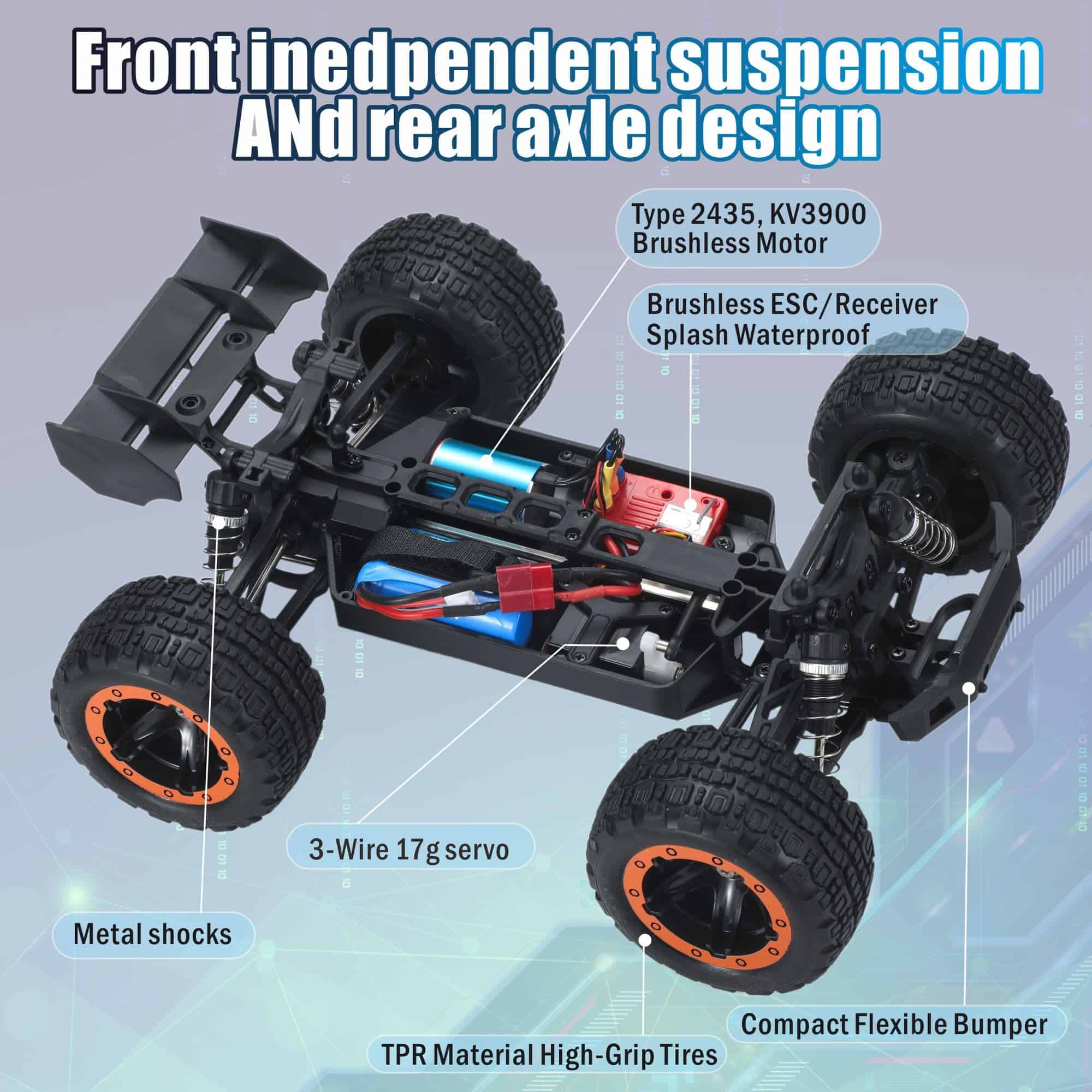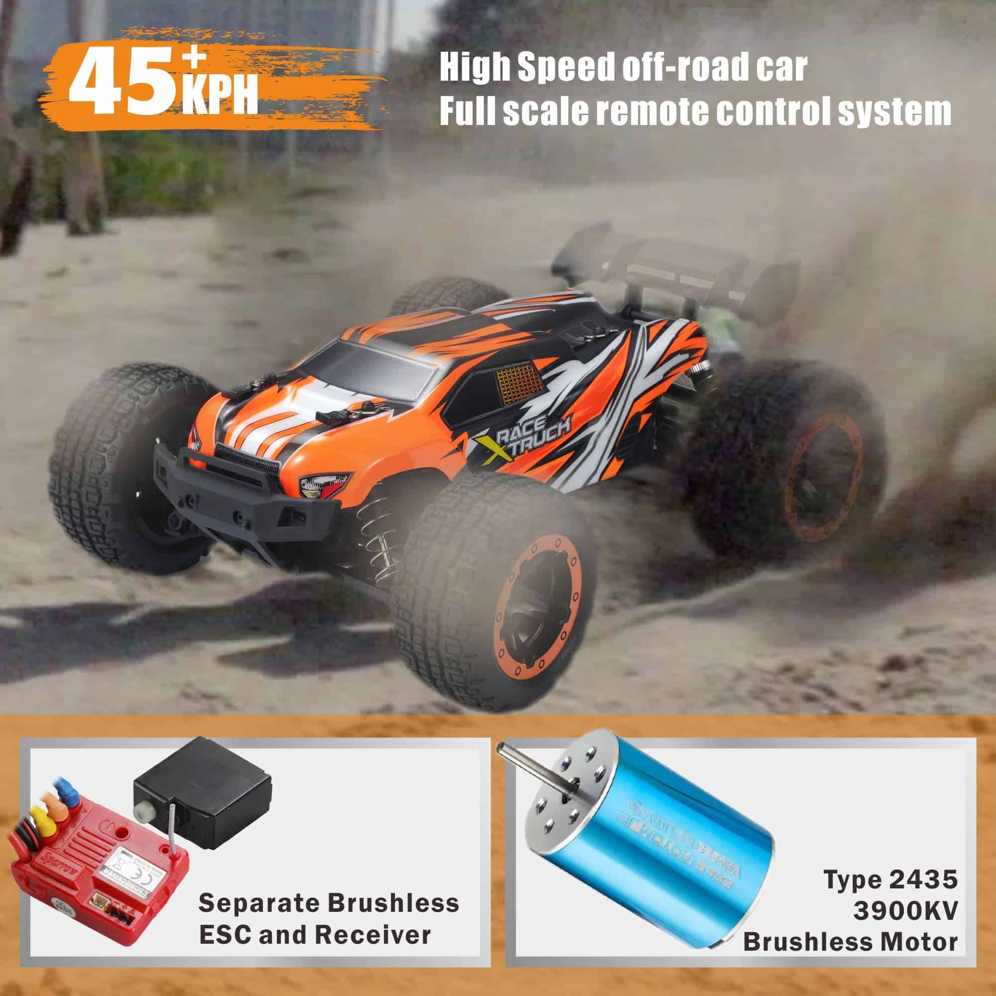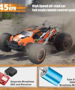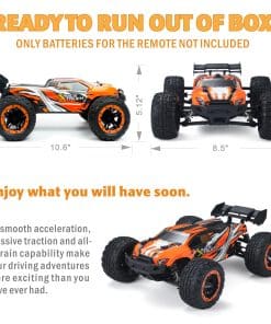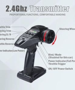 3. Excelente sistema de control remoto Este rápido coche de control remoto puede ser controlado con un sistema de radio de 2.4GHz desde hasta 330 pies (100 metros) puede competir con muchos coches de carreras sin ninguna interferencia de señal. Su control de rango de velocidad es amigable para diferentes curvas y pistas. Este vehículo RC utiliza un servo digital independiente de 3 hilos de 2.5KG para un excelente rendimiento de dirección.