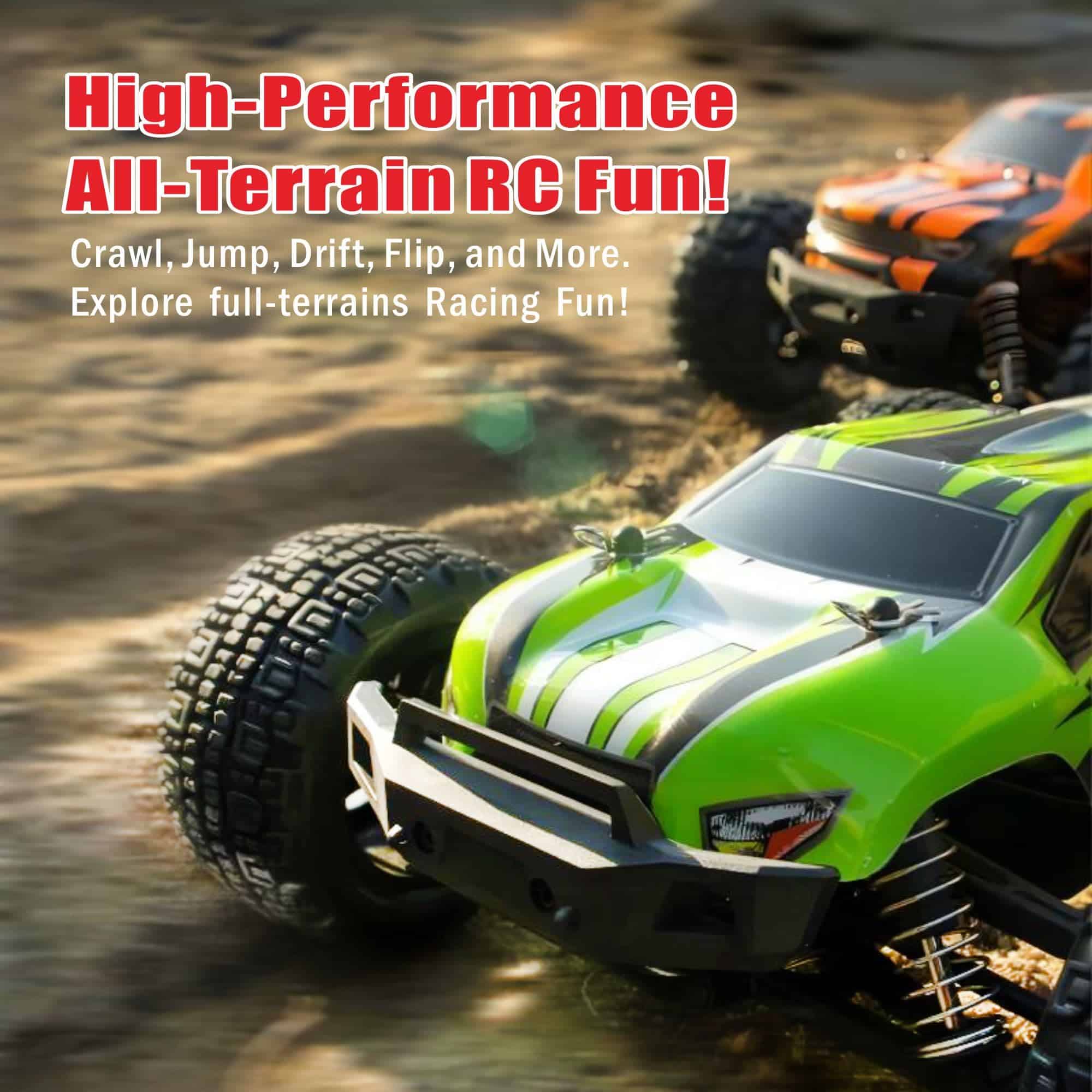 4. Absorber baches y reducir vibraciones Los amortiguadores llenos de aceite ayudan a absorber baches y reducir vibraciones para mejorar la maniobrabilidad y estabilidad. Esto permite que el camión RC 4X4 maneje terrenos difíciles, como arena, caminos de grava, hierba o carreteras de concreto.