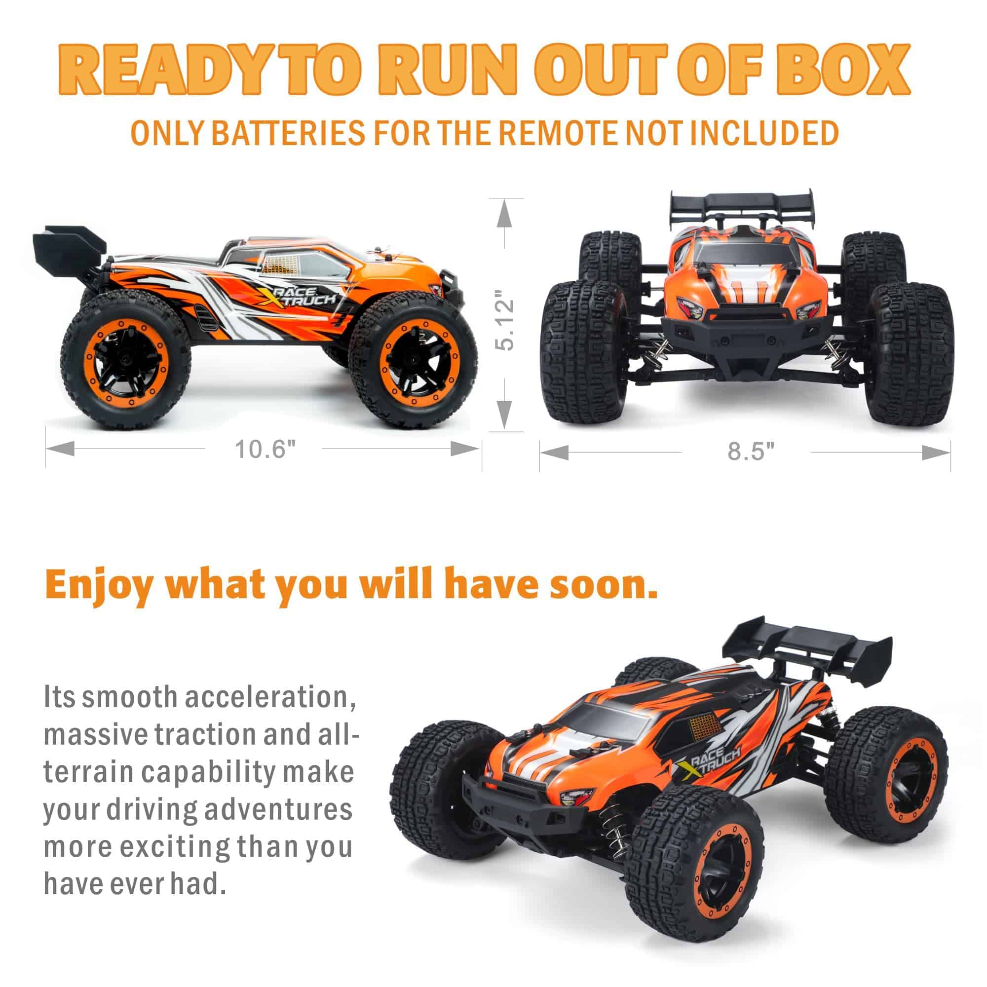 5. Más TIEMPO DE JUEGO El Camión RC todoterreno 4WD está equipado con baterías de alta calidad de 1300mAh, puedes disfrutar de conducción durante más de 20 minutos a la vez. ¡Con solo un paseo, verás por qué nuestro coche todoterreno de alto rendimiento a un nuevo nivel!.