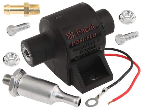 Para los requisitos de combustible bajos de motores carburados de hasta aproximadamente 100 caballos de fuerza, una sola bomba de combustible Posi-Flo como esta suele ser suficiente. Las bombas de combustible Facet tienen bajos requisitos de potencia (alrededor de 1.5 amperios a 12 voltios) y funcionan sin sellos o diafragmas problemáticos. Las bombas Posi-Flo cuentan con un chasis compuesto negro para una operación más silenciosa. La válvula de alivio de presión integrada significa que no habrá inundaciones después de apagar un motor caliente. Las bombas Facet son compatibles con gasolina, mezclas de alcohol (hasta E85), diesel, biodiesel y aditivos para combustibles. Este kit completo de bomba incluye la bomba Posi-Flo de Facet, hardware de montaje, un filtro de 74 micrones que se enrosca en el puerto de entrada y acepta su manguera de combustible de goma de 5/16″ de diámetro interno, y un adaptador que se enrosca en el puerto de salida y acepta su manguera de combustible de goma de 5/16″ de diámetro interno. Entrega máxima de combustible 25 galones por hora. Presión máxima de 1.5 a 2.5 psi. Flujo típico 10 galones por hora a 1 psi. Puertos hembra de 1/8 NPT. Esta bomba no tiene una válvula anti-sifón, por lo que el combustible puede pasar a través de la bomba cuando la bomba está apagada. Una válvula de retención unidireccional integrada evita que el combustible se drene hacia atrás a través de la bomba.