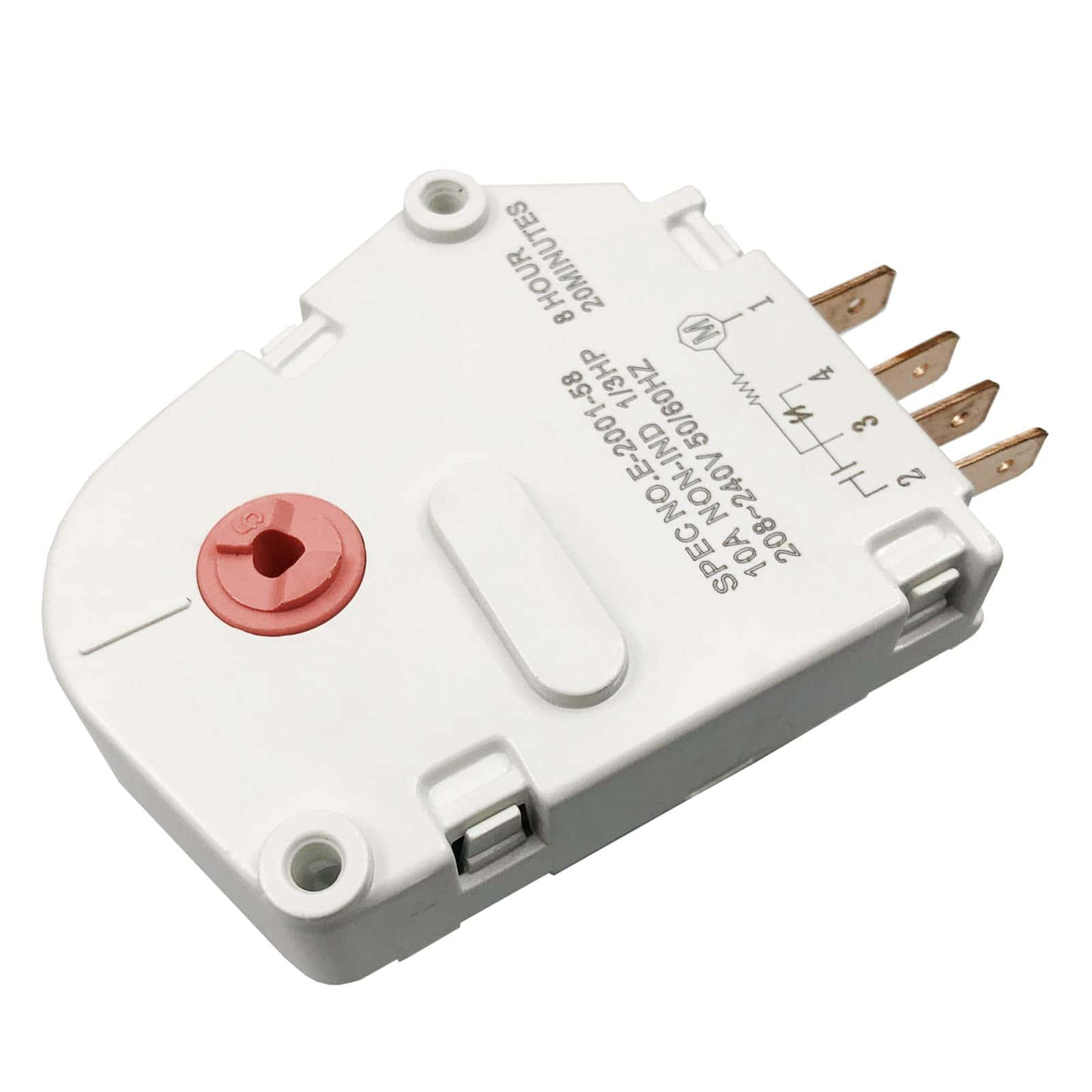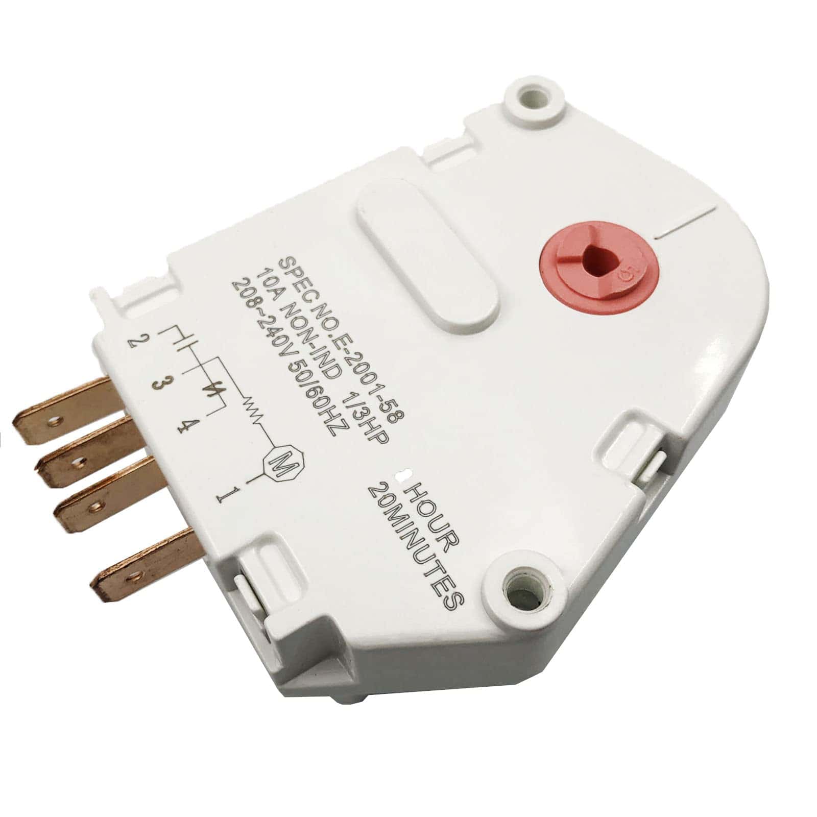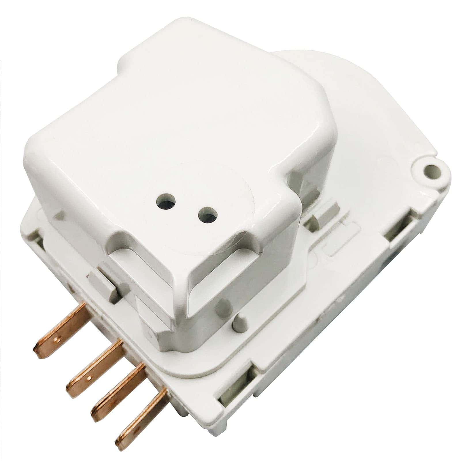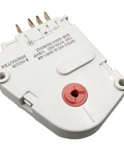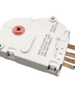 Temporizador de descongelación de refrigerador número de parte 5304518034. Temporizador de 12 horas. Terminales marcados 2,1,4,3. Reemplazo compatible con números A1341, F127233, 624727, 624729, 626218, 627159, 628515, 628516, 628517, 216517400, 8037967, 5308037967, F129880, 216744400, 216744500, F000127233, F000129880, 8037960, 216563000, 297318010, 5304516309, AP6799886 y PS12585793. Diseñado para ser compatible con modelos específicos de refrigeradores fabricados por Electro-lux incluyendo Crosley, Frigidaire, Gibson y Kelvinator.