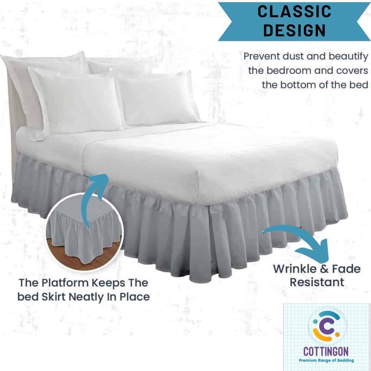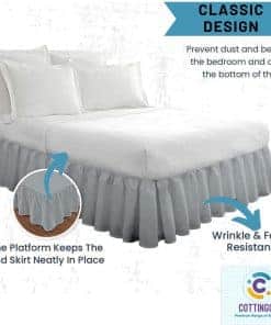 Diseño de volantes encantador que presenta volantes recogidos alrededor de 3 lados de la cama para un aspecto clásico y hermoso. Este faldón de cama con volantes tiene esquinas divididas para una apariencia atractiva. Colores pre-encogidos, resistentes a la decoloración y a las arrugas para una longevidad óptima.