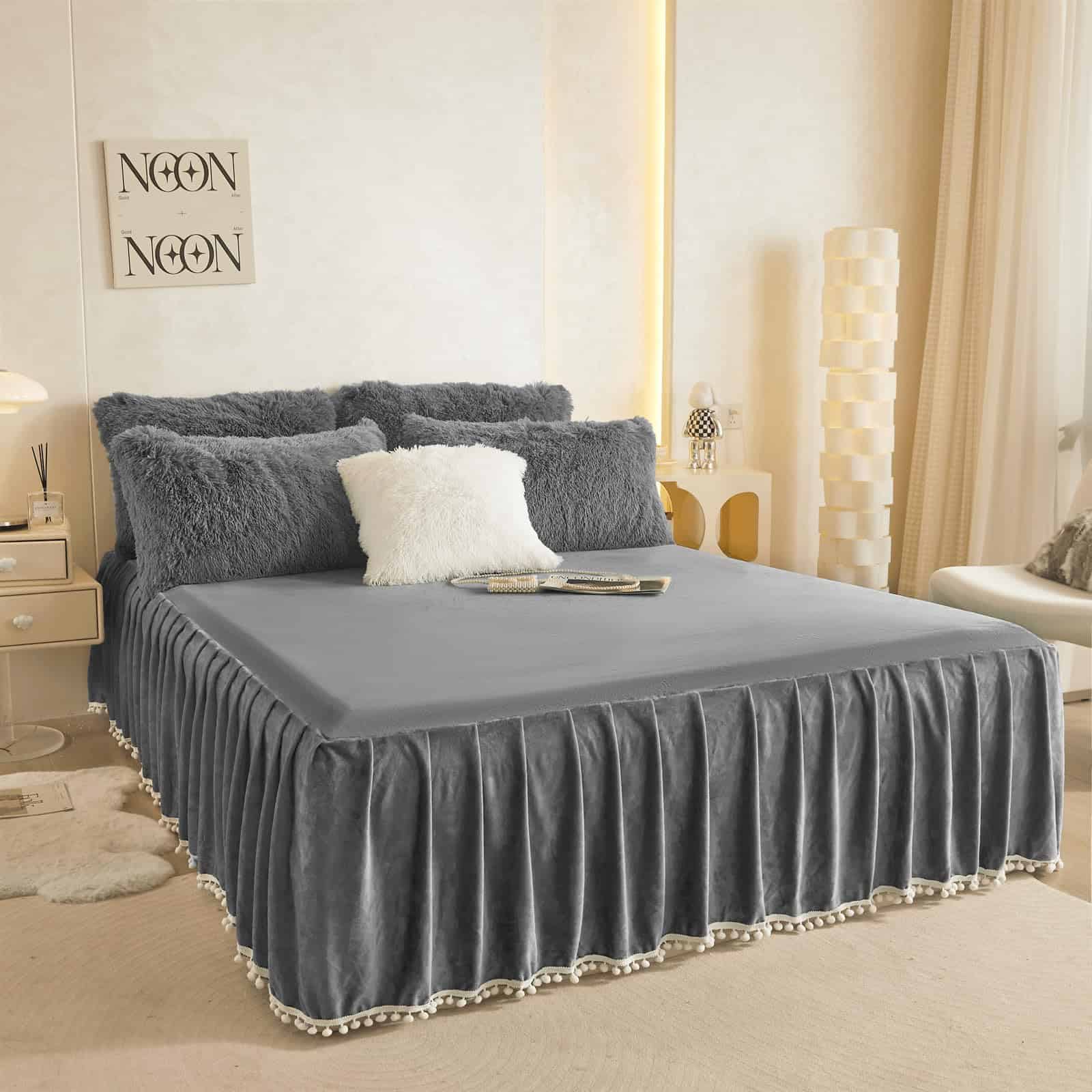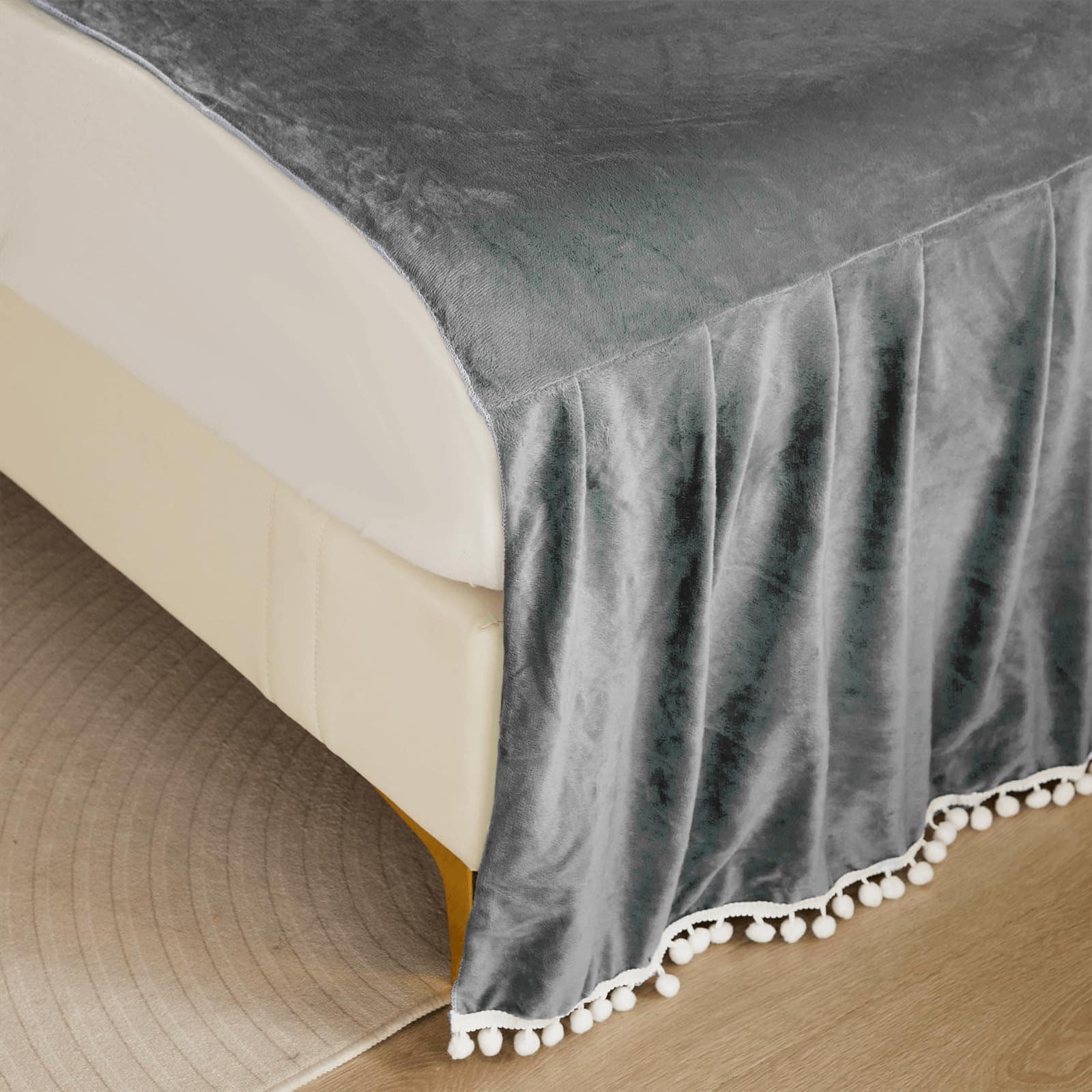 Faldón de Cama de Terciopelo con Pompones, -Gris Oscuro
