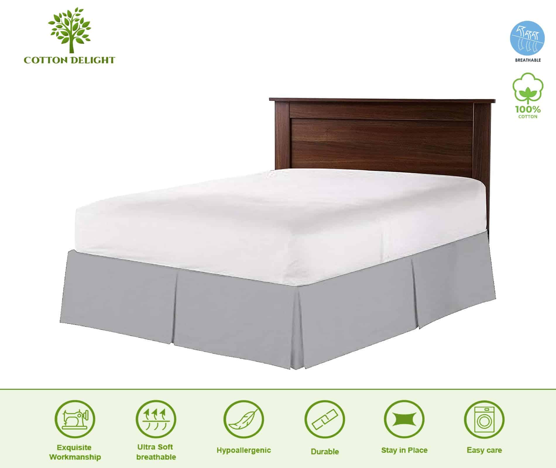 Faldón de cama plateado de lujo hecho éticamente con 100% auténtico algodón natural de los mejores hilos de algodón orgánico. Siéntase la diferencia: duerma mejor y despierte cada mañana sintiéndose renovado y lleno de energía. Suave y exquisito, especialmente tejido de algodón satén ultra fino para obtener la máxima comodidad en un faldón de cama. El mejor para cualquier habitación de su casa: dormitorio, habitación de invitados, habitación infantil, RV, casa de vacaciones. Excelente idea de regalo para hombres y mujeres, mamás y papás, Día de San Valentín, Día de la Madre, Día del Padre y Navidad. Cuidado fácil: los faldones de cama están hechos de material fino que resiste a lavados repetidos y se ve genial. Lávelo a máquina en frío y séquelo a temperatura baja. Sostenibilidad: su nuevo faldón de cama se revisa minuciosamente para garantizar la máxima seguridad y comodidad. Cada pulgada de nuestra tela cumple con los estándares de rendimiento más altos del producto. Revisiones exhaustivas del producto y auditorías continuas garantizan la sostenibilidad. Cada pieza de tela se mide individualmente y cada prenda está cosida a la perfección. Antes de empaquetar, inspeccionamos cada pieza individualmente para garantizar que sea impecable.
