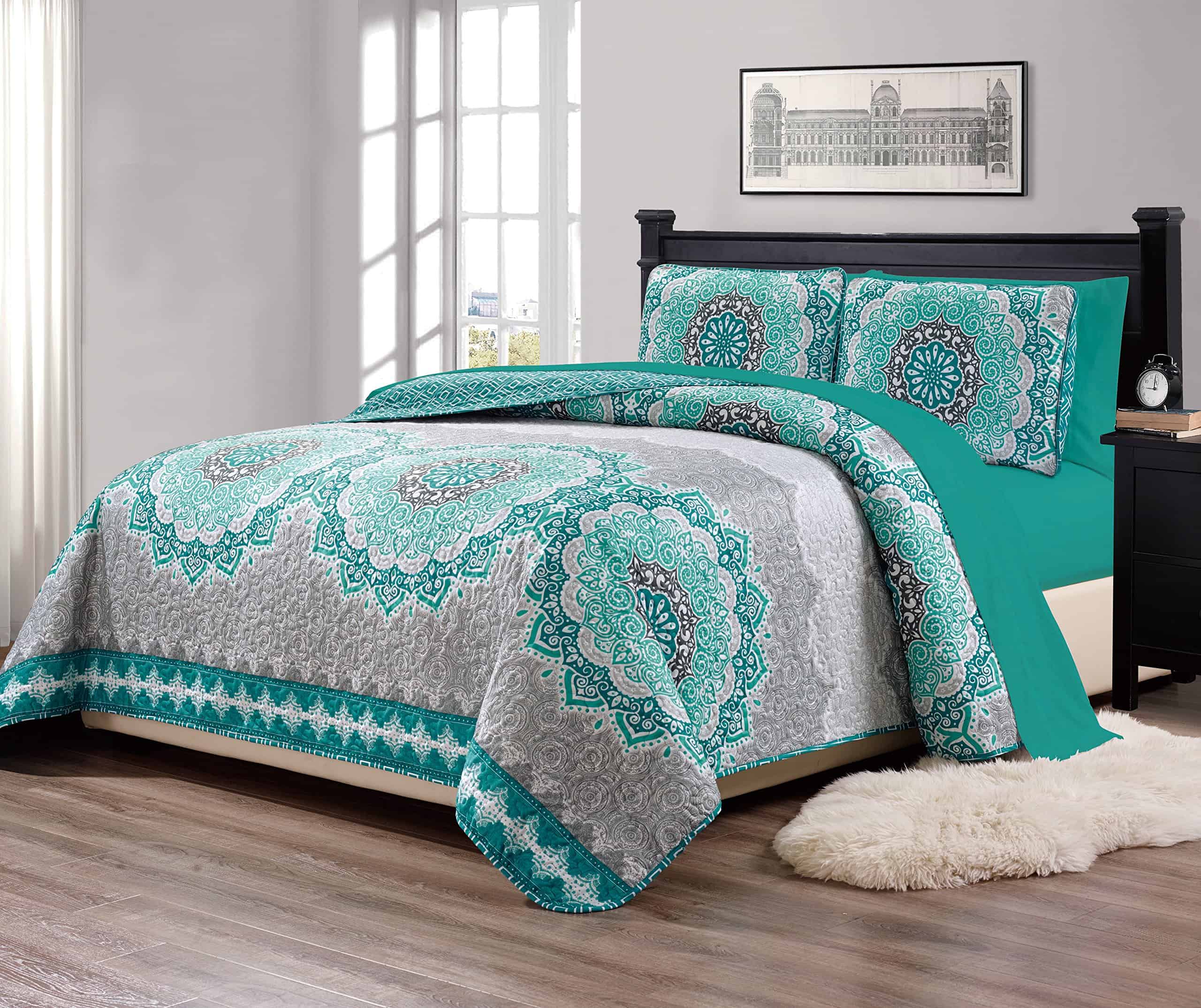 Fancy Collection 7 Pc Queen Colcha de Cama Acolchada de Tamaño Extragrande con Juego de Sábanas a Juego Aqua Turquesa Coastal Plain/Verde Gris Blanco Diseño Elegante Nuevo