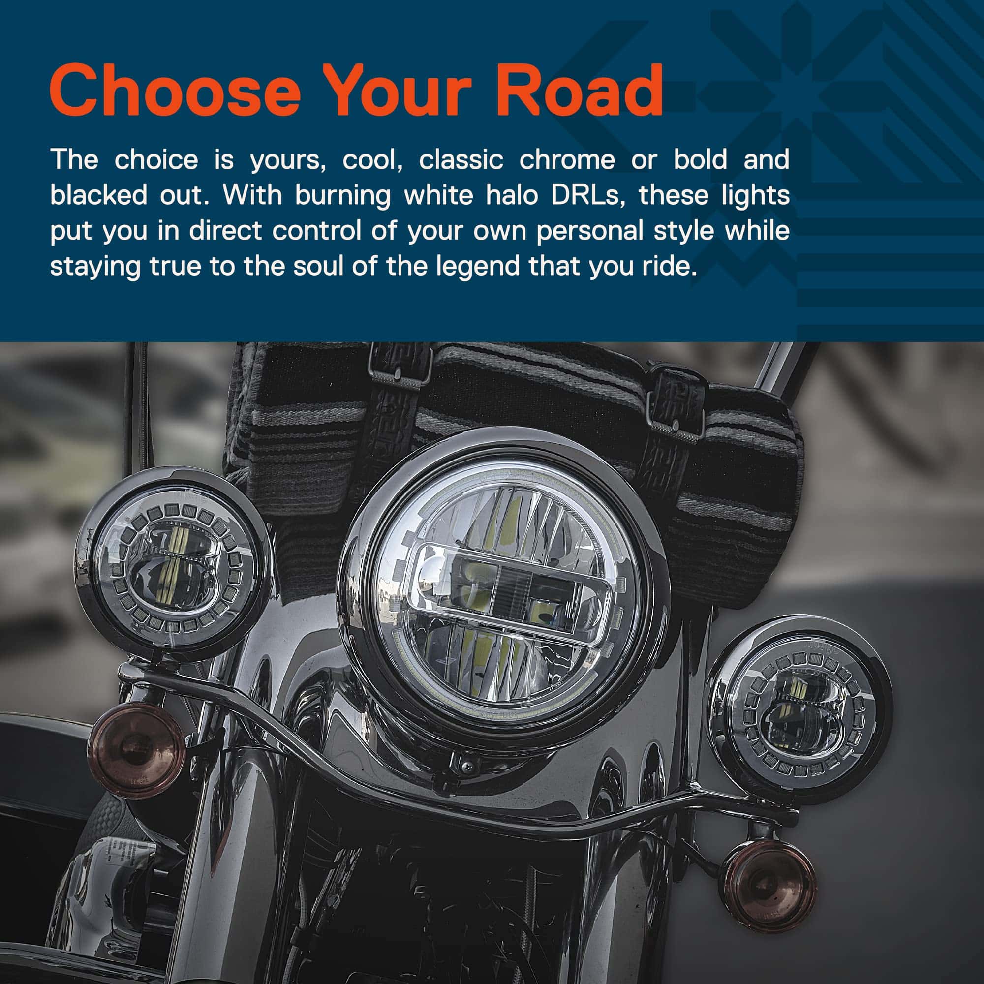3. CHOOSE YOUR ROAD – La elección es tuya, cromo clásico o audaz y en negro. Con DRLs de halo blanco ardiente, estas luces te permiten controlar directamente tu propio estilo personal mientras te mantienes fiel al alma de la leyenda que conduces.