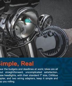 5. SIMPLE, REAL – Deja los presupuestos y plazos en el trabajo; las motos se tratan de satisfacción sencilla y sin complicaciones. Estos faros, con su tamaño estándar de 7″, adaptador CANbus y dos adaptadores de cableado, mantienen las cosas simples y te mantienen rodando.