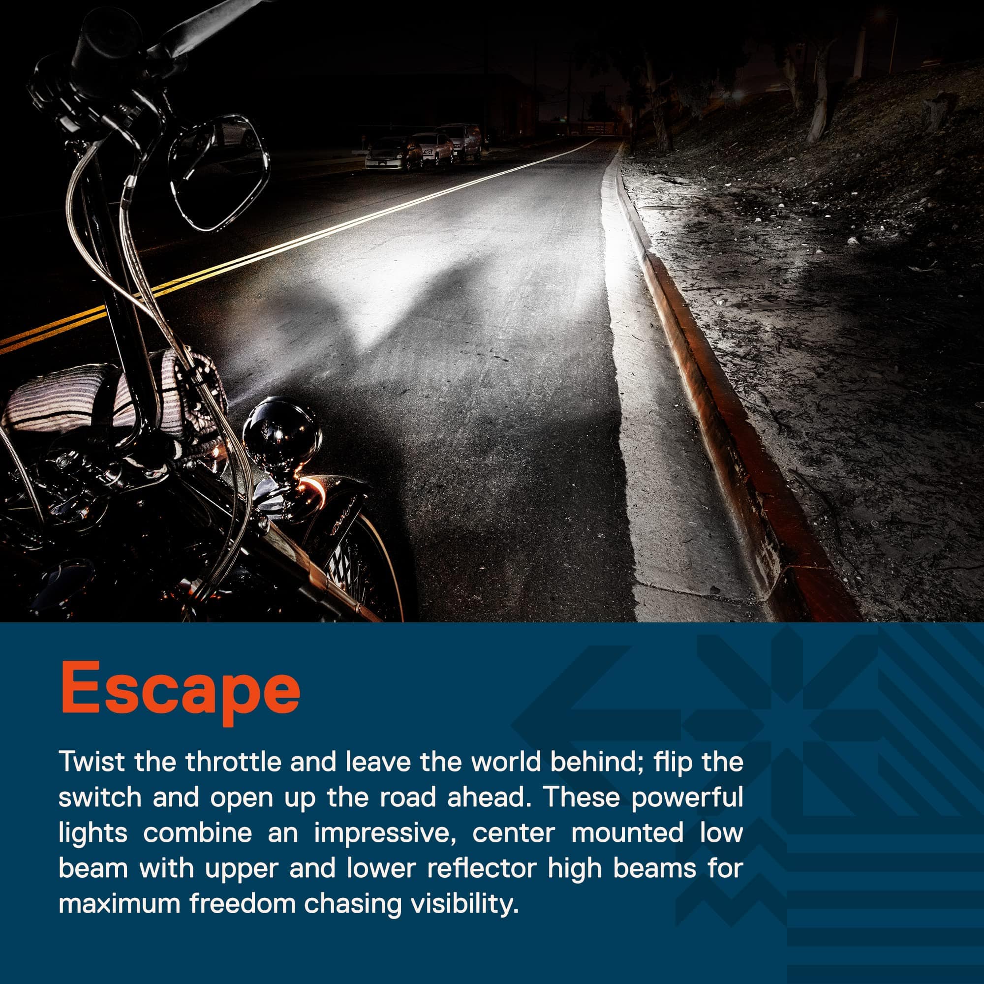 2. ESCAPE – Gira el acelerador y deja el mundo atrás; acciona el interruptor y abre el camino por delante. Estas potentes luces combinan un impresionante haz bajo central con haces altos reflectantes superiores e inferiores para una máxima visibilidad en la libertad de la carretera.