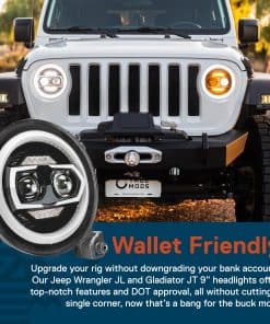 4. AMIGABLE CON EL BOLSILLO – Actualiza tu vehículo sin deteriorar tu cuenta bancaria. Nuestros faros de 9″ para Jeep Wrangler JL y Gladiator JT ofrecen características de primera calidad y aprobación de la DOT, todo sin recortar un solo rincón, eso es una modificación que vale la pena.