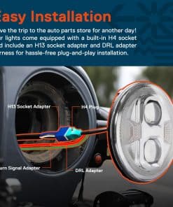 5. INSTALACIÓN FÁCIL – ¡Ahorra el viaje a la tienda de autopartes para otro día! Nuestro kit de ensamblaje de faros de siete pulgadas viene equipado con un zócalo H4 incorporado e incluye un adaptador de zócalo H13 y arnés adaptador DRL para una fácil sustitución plug-and-play.