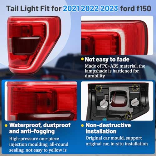 2. Materiales de calidad: Nuestros faros traseros compatibles con Ford F150 2021 están hechos de carcasas de policarbonato de alta calidad que cumplen o exceden los estándares OEM. Este faro trasero compatible con Ford F150 2021-2023 es a prueba de agua, a prueba de polvo y a prueba de golpes.