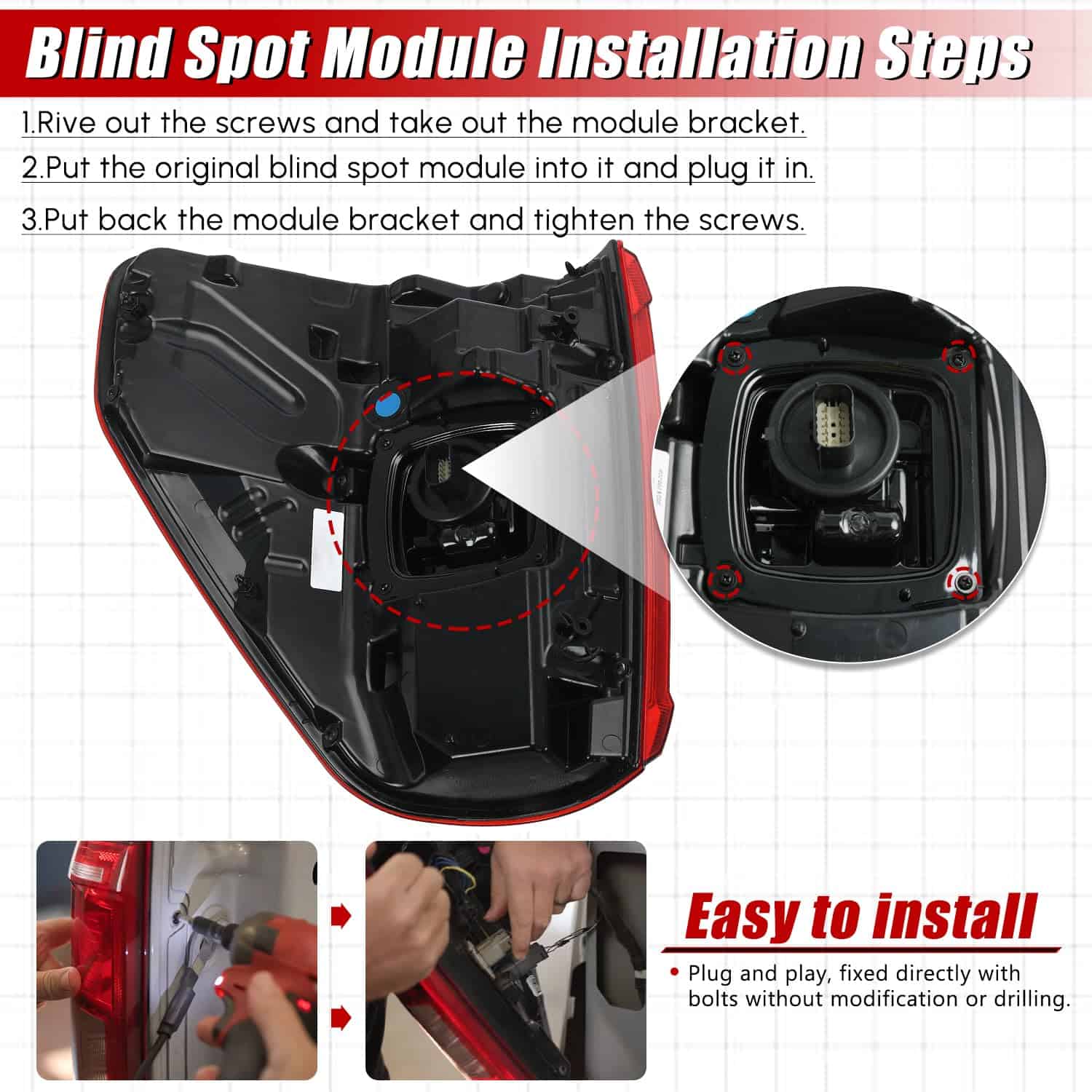 4. Fácil de instalar: Plug and play, se fija directamente con pernos sin necesidad de modificaciones o perforaciones.