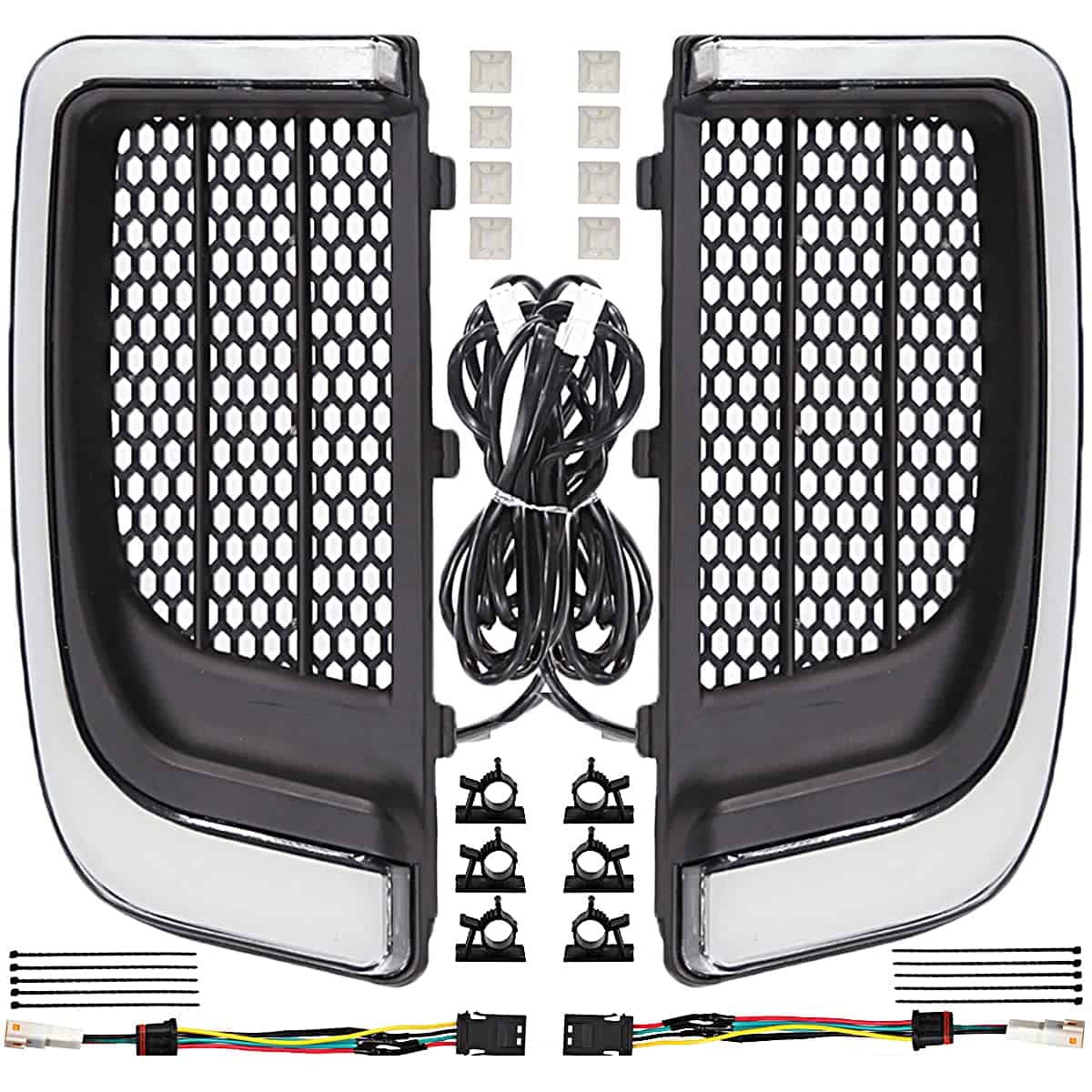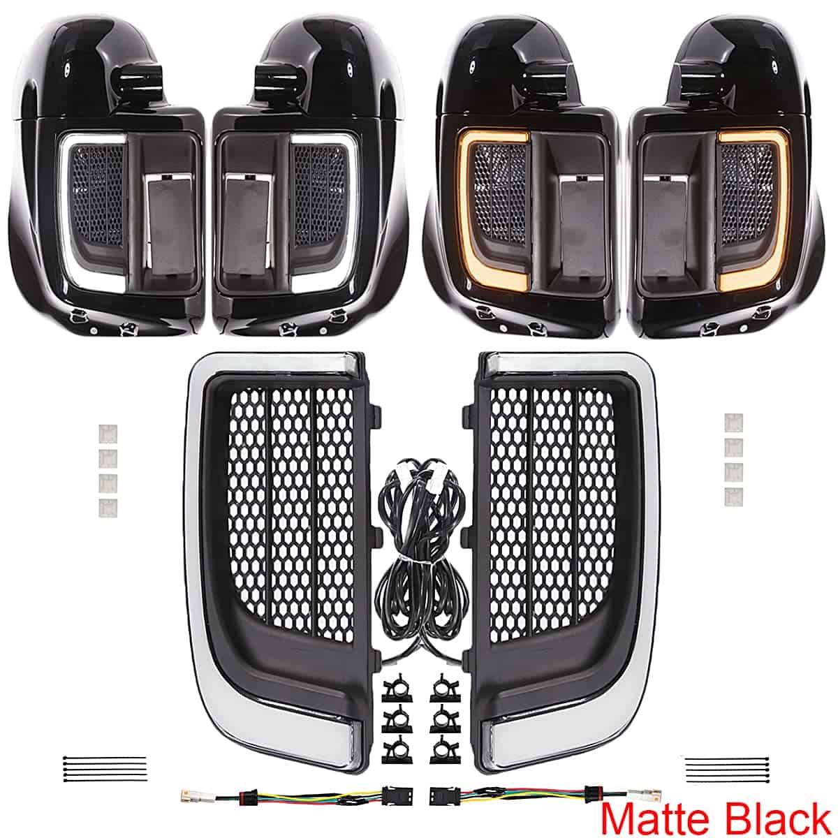 Características: Condición: 100% nuevo. Color: Negro Mate. Colocación en el vehículo: Izquierda, Derecha, Delante. Construcción duradera de ABS moldeado por inyección con lentes de policarbonato ahumados. Presenta un elegante efecto de iluminación difusa (sólida) con alta intensidad de salida. Luces de circulación blancas a tiempo completo con funcionalidad de señal de giro ámbar. Fácil instalación con cableado listo para enchufar. Disponible en carcasas cromadas o negras satinadas. Ajuste para Harley Touring ’14-’19 FLHTCU, ’15-’16 FLHTCUL, ’14-’20 FLHTK, ’15-’19 FLHTKL, ’14-’20 FLHTKSE, ’16-’19 FLTRU, ’20 FLTRK, ’15-’16 FLTRUSE, ’15-’19 FLHXSE y ’14-’20 FLHTCUTG, ’20 FLHTCUTGSE. Paquete incluido: 1 juego de farolas inferiores LED, conectores de cables (No incluye la farola inferior).