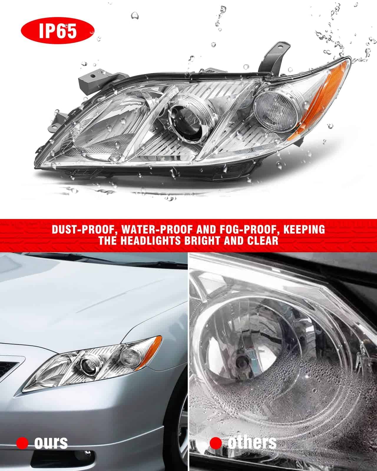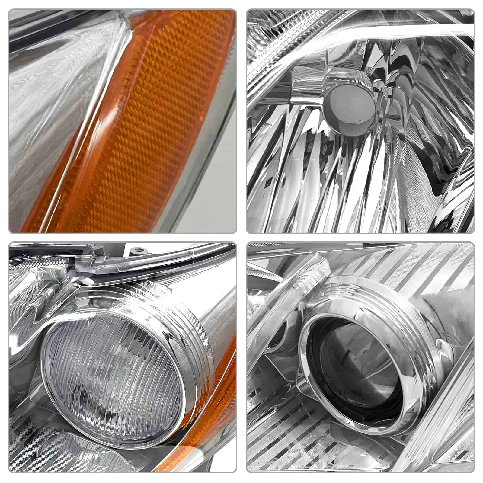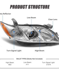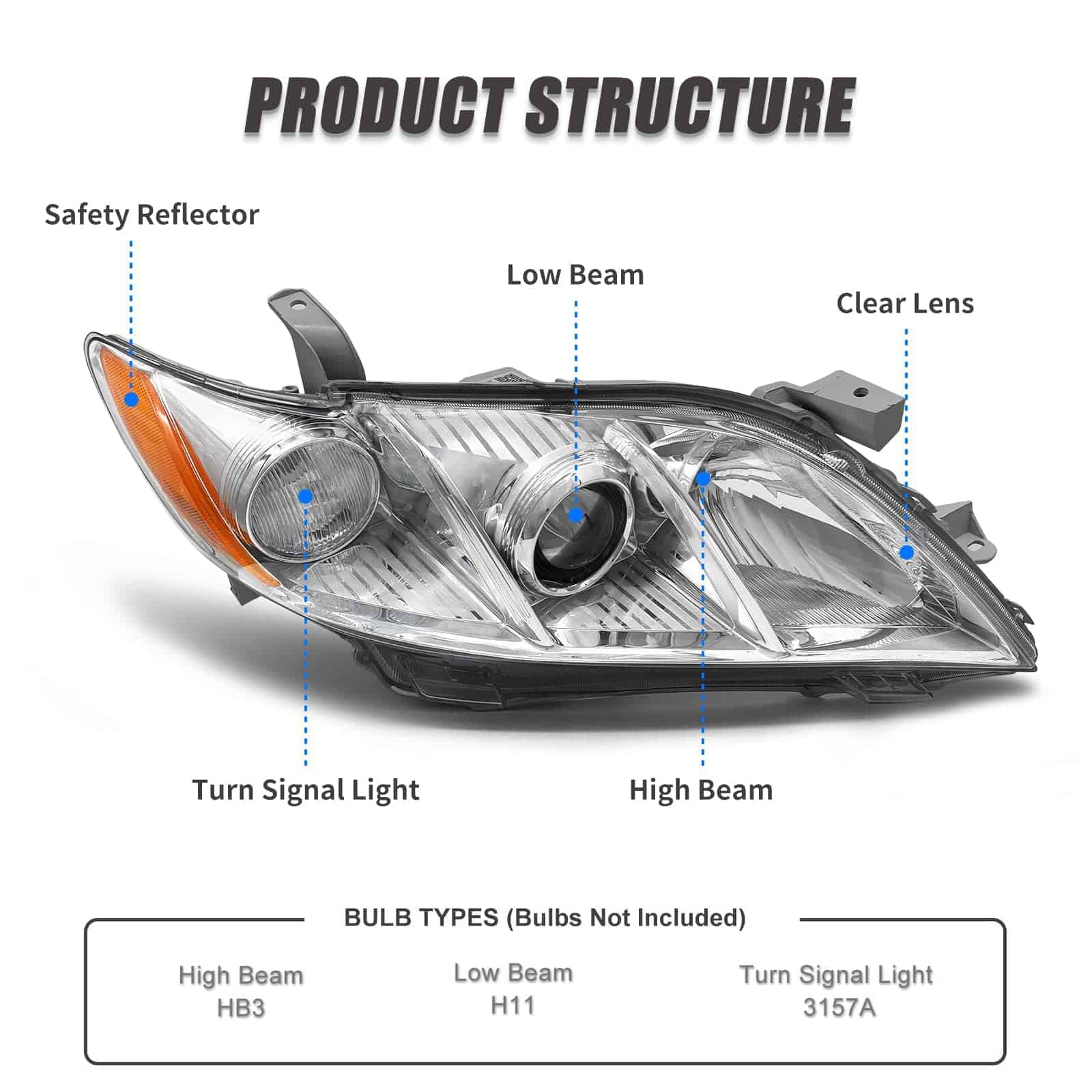 ¡Es hora de cambiar su Conjunto de Faros Delanteros! ¿Por qué gastar tanto dinero en el taller de mantenimiento de automóviles? Solo necesita un par de faros nuevos, y su automóvil lucirá como nuevo. DISEÑO Compatible con Toyota Camry 2007 2008 2009 Número de Pieza Equivalente OEM: 81170-33661/81130-33661 Partslink: TO2502174/TO2503174 Condición: Nuevo Color: Cubierta Cromada Reflector Ámbar Paquete Incluye: Lado del Conductor y Lado del Pasajero Certificaciones: DOT, SAE Atención: Este producto no incluye bombillas Modelo de Bombilla: Baja: H11 Alto: HB3 Luz de Señal: 3157A Luz de Marcador Lateral: W5W (Bombilla no incluida)