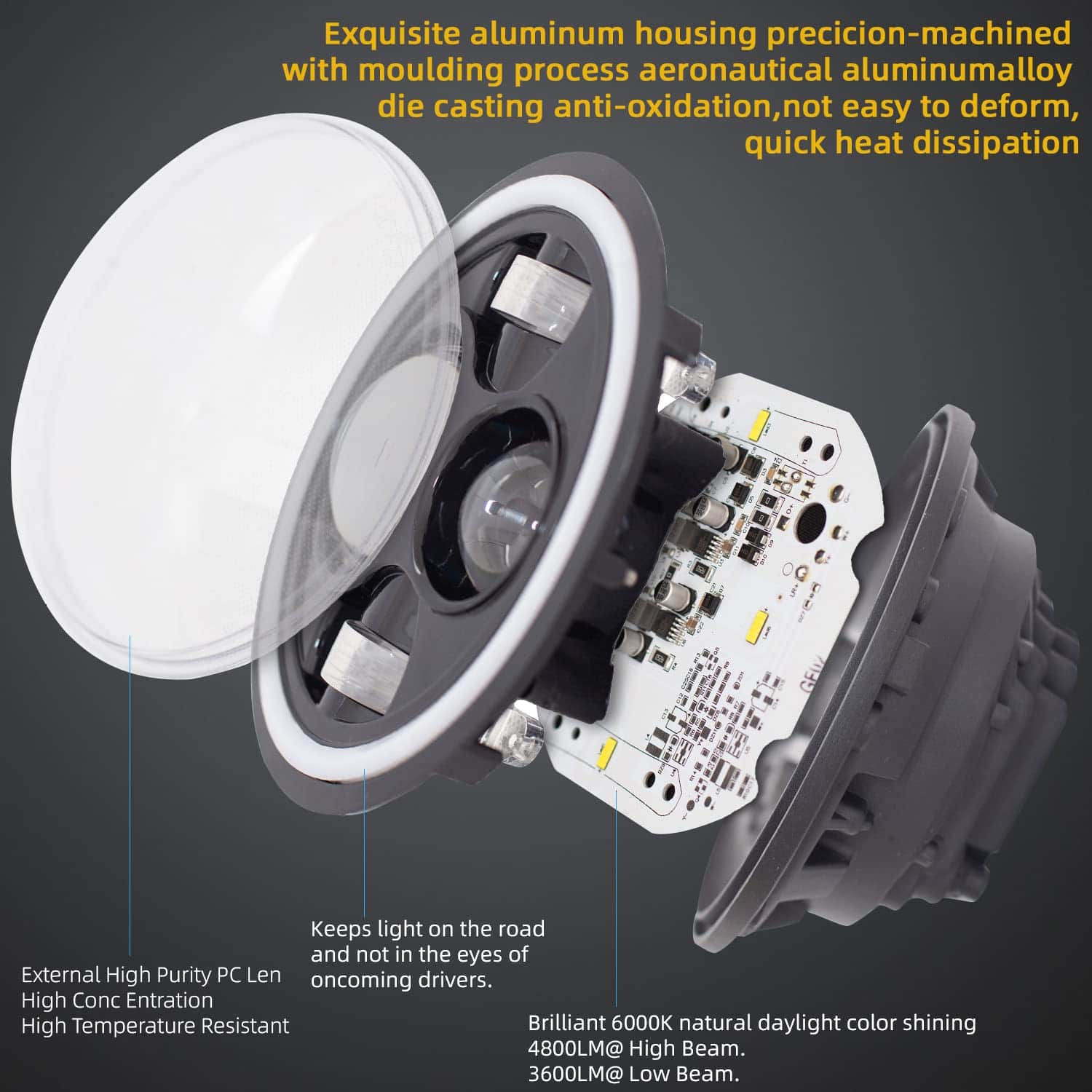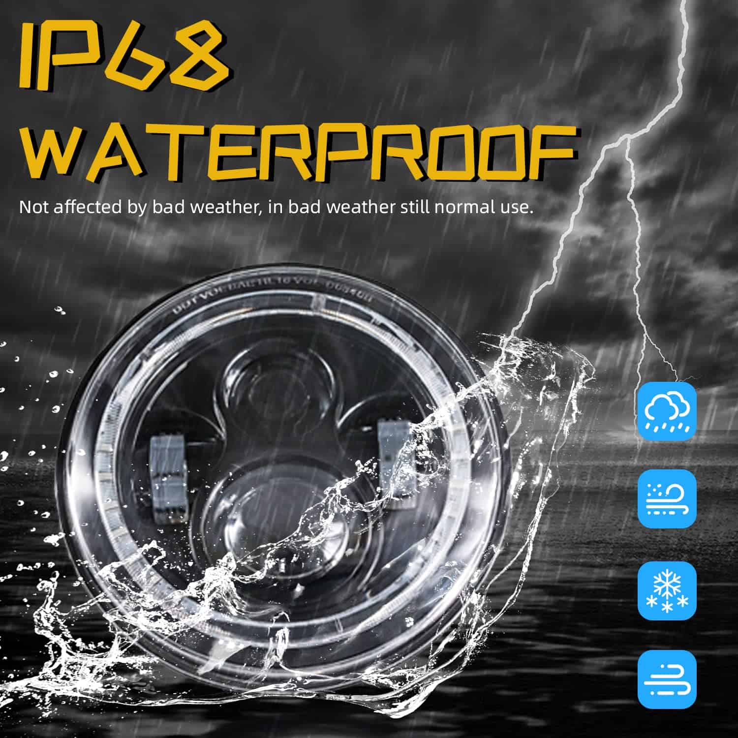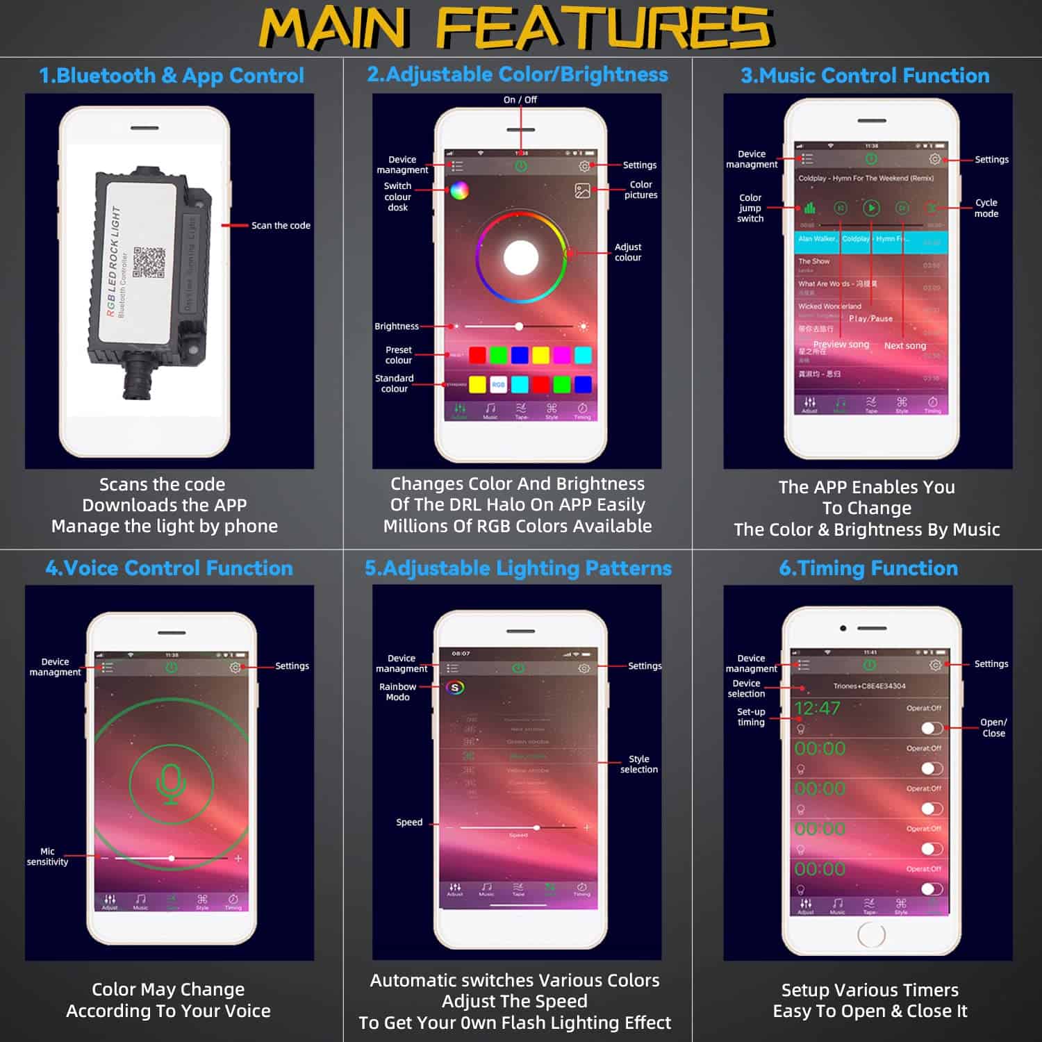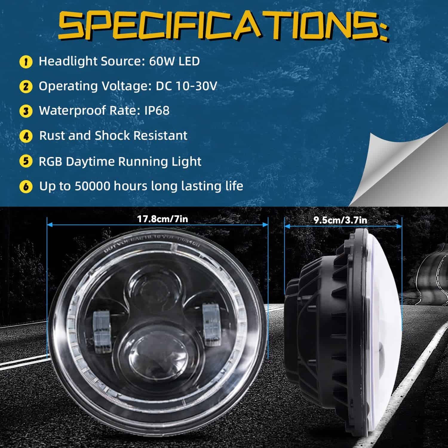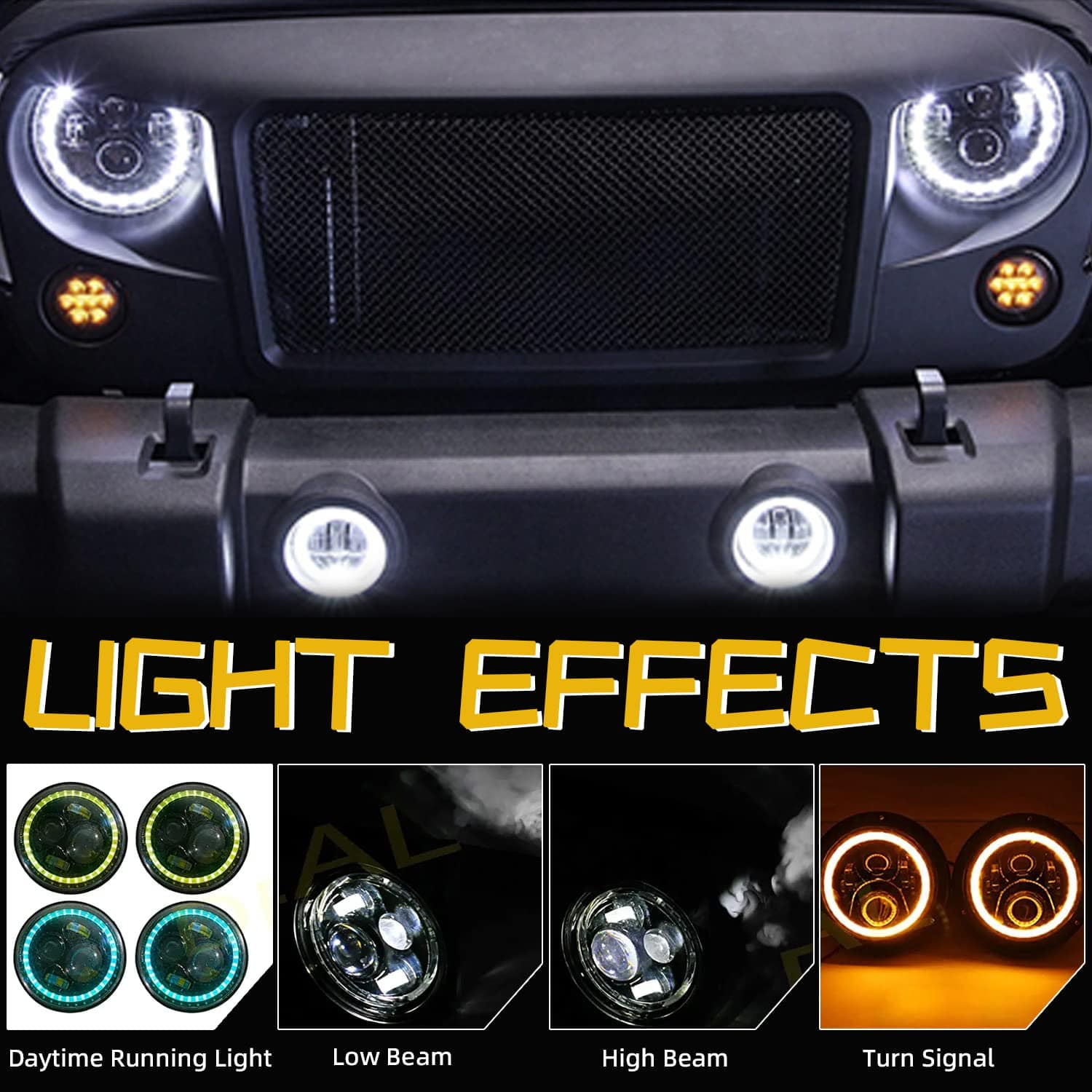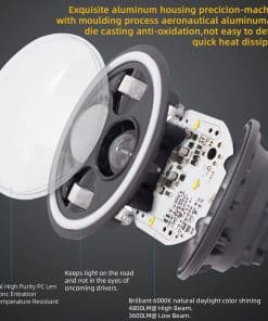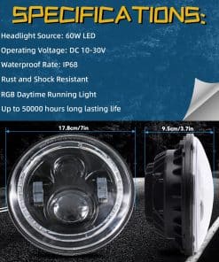 Compatibilidad: Los faros pueden adaptarse a modelos con faros sellados redondos 6012/6014/6015/H6017/H6024, asegúrate de que sea compatible. Especificaciones: Fuente de luz: LED de 60W Voltaje de funcionamiento: DC 10-30V Resistente al agua: IP68 Resistente al óxido y a los golpes Luz diurna RGB con hasta 50000 horas de vida útil Función y color de luz: Luz alta del proyector: Blanca Luz baja del proyector: Blanca Luz intermitente LED del aro de halo: Ámbar Luz de marcha diurna LED del aro de halo: RGB, con múltiples colores disponibles Instalación: Conexión plug & play, escanea el código en el controlador Bluetooth, descarga e instala la APP. Los adaptadores LED CANBUS y H4-H13 se incluyen para adaptarse a tus conectores originales. Los faros RGB Halo de DEAL vienen con conexión plug & play, protección de bajo voltaje, funcionan y lucen increíbles, son súper brillantes y tienen una buena cobertura de la carretera, mantienen la luz en la carretera y no en los ojos de otros conductores, la noche nunca termina. Los faros DEAL están fabricados con una duradera carcasa de aluminio fundido negro con lente de PC transparente, cuentan con LED de alta calidad para automóviles, chip controlador constante de corriente de alta precisión, gestión de calor fácil y sencilla, hasta 50000 horas de vida útil, además se adaptan a tu juego de aros de halo RGB personalizado. Funcionan bien, iluminan tu camino con un diseño fantástico y deslumbran a la multitud mientras conduces.
