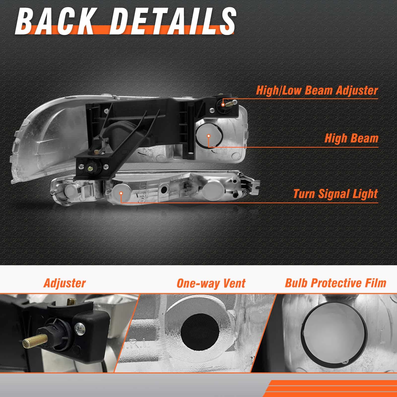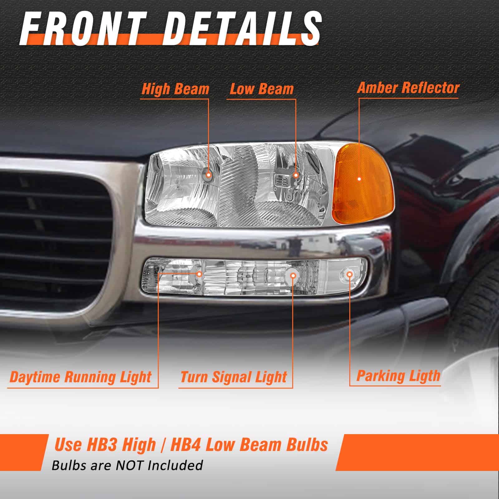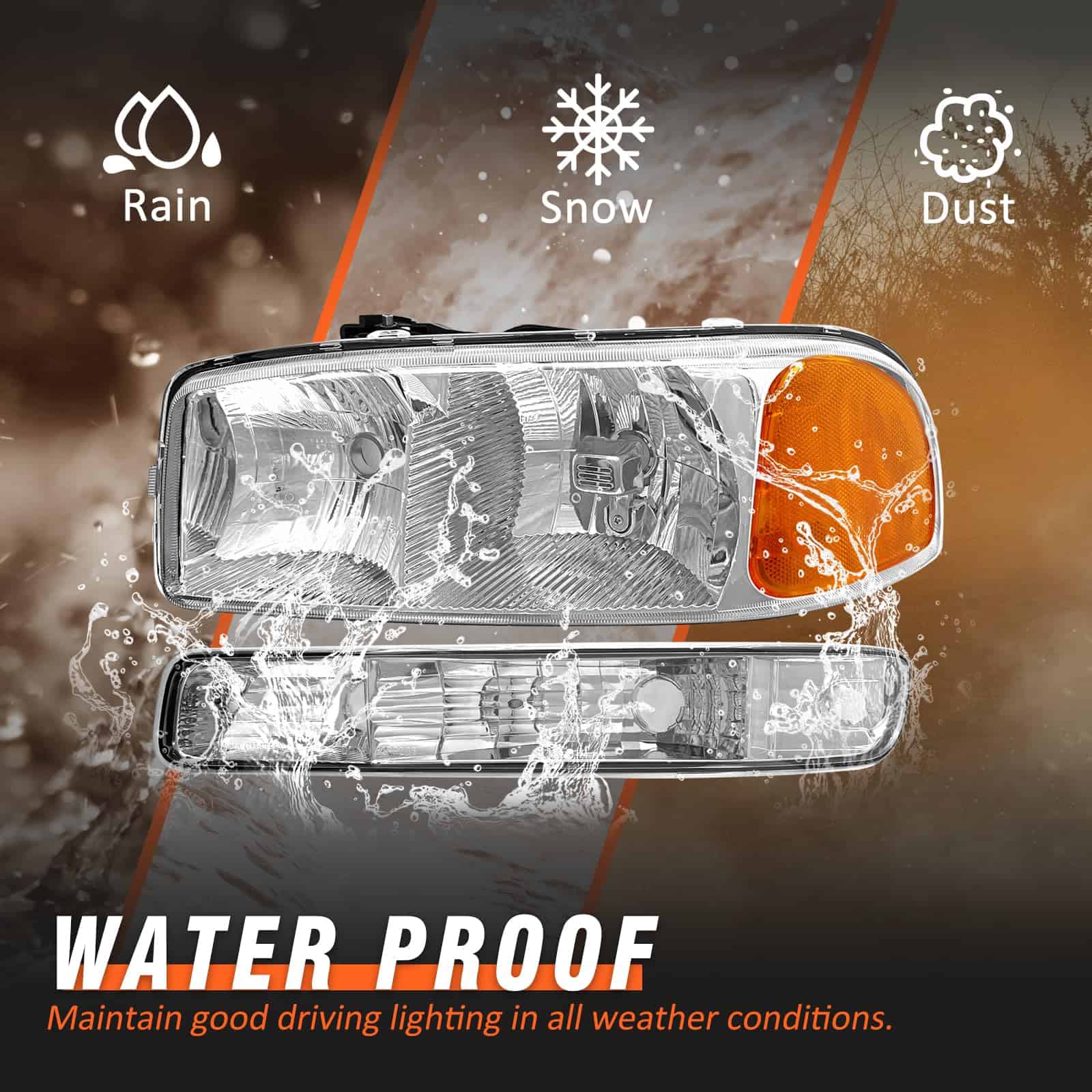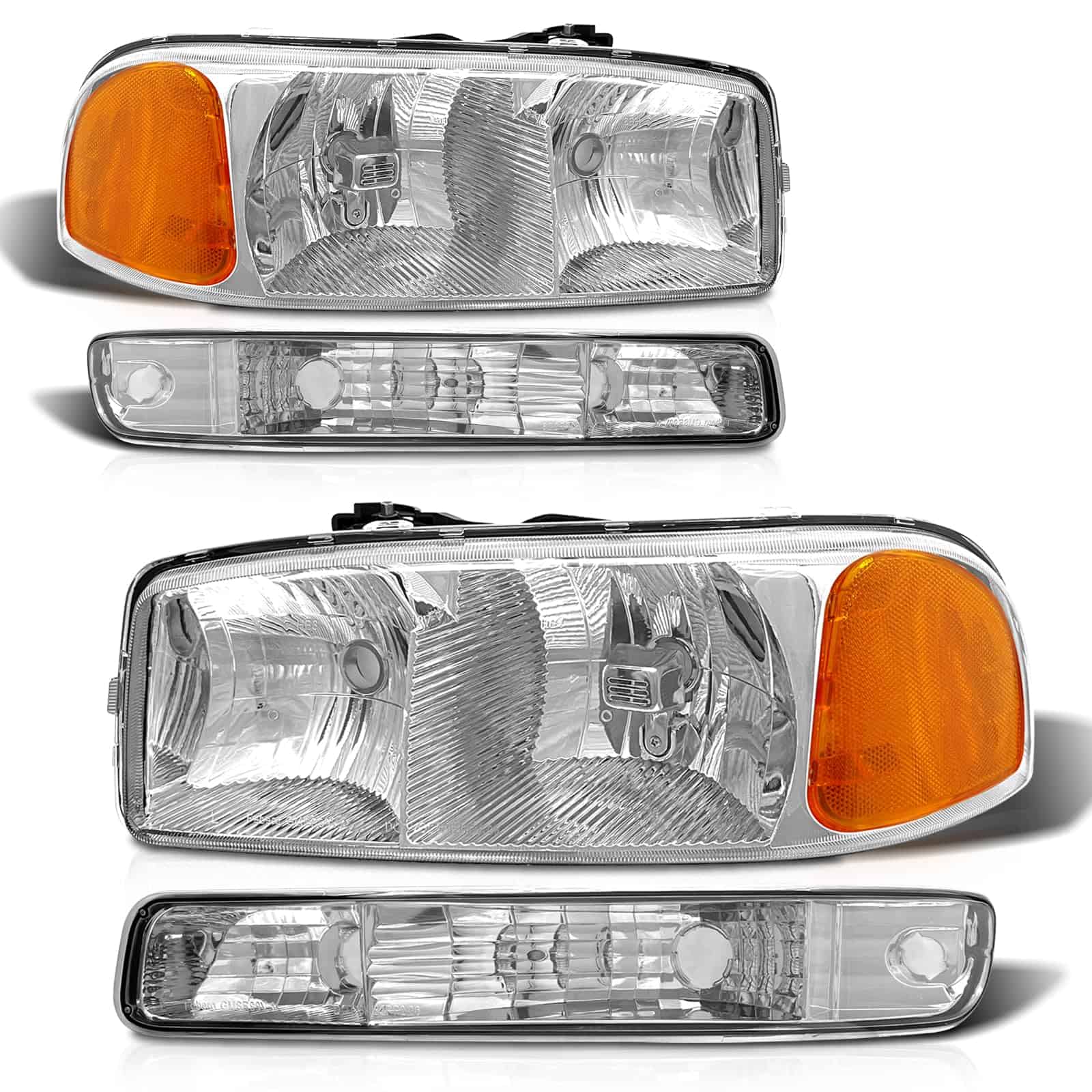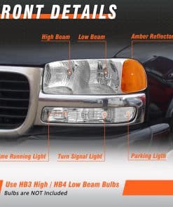 Faros delanteros compatibles con 1999-2006 GMC Sierra 1500 2500 3500 / 00-06 GMC Yukon 1500 2500 XL Conjunto de faros con carcasa cromada Reflector ámbar Lente clara de reemplazo. Este conjunto de faros delanteros es compatible con varios modelos de vehículos GMC, incluidos los Sierra 1500, 2500, 3500 y Yukon 1500, 2500 XL. La carcasa cromada y el reflector ámbar le dan a estos faros un aspecto distintivo y elegante. La lente clara ayuda a proporcionar una iluminación más brillante, lo que facilita a otros conductores notarte durante la noche y mejora la seguridad al conducir. Los materiales de alta calidad y la mano de obra fina garantizan el rendimiento y la durabilidad de estos faros. El nivel impermeable IP65 evita la acumulación de agua en las lámparas, y la excelente selladura ayuda a que funcionen perfectamente en diversos entornos. Este conjunto de faros delanteros viene en pares con lados de conductor y pasajero, lo que facilita la instalación. El diseño plug-and-play permite una instalación rápida y sencilla, sin necesidad de técnicas complicadas ni perforación. Además, ofrecemos una garantía de 12 meses en nuestros productos y un excelente servicio postventa para ayudarte a resolver cualquier problema que puedas encontrar después de tu compra