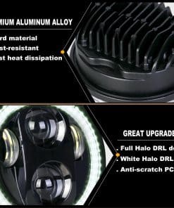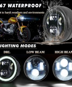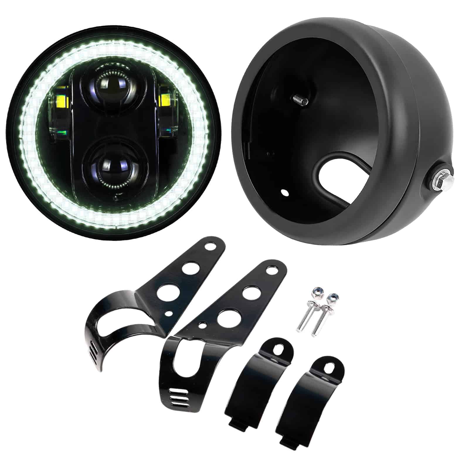Faros delanteros de motocicleta con cubierta de 5-3/4 5.75″ LED Faro Halo Ahumado Blanco DRL Compatible con Shadow Buell Blast Cafe Racer Motorbikes. Faro delantero de motocicleta de 5.75 pulgadas con cubierta de faro compatible con Buell Blast/ Chopper/ Cruiser/ Bobber/ Cafe Racer/ Metric Bikes/ Knighthawk/ Shadow 500/ Shadow 750/ Rebel 500/ VLX 600/ Spirit 1100/ Vulcan 900, etc. Cubierta de faro de motocicleta negra con faro LED de 5-3/4″ hecha de chips de led de alta calidad para una mayor luminosidad que los faros halógenos, aleación de aluminio premier para una rápida disipación del calor y lente de policarbonato resistente a los arañazos, resistente al óxido y anticorrosión. Faro LED de motocicleta con halo completo ahumado BLANCO DRL, dale a tu motocicleta un estilo único, ilumina bien las carreteras, mantén tu aventura con un sistema de iluminación mejorado, mejora tu visibilidad nocturna, asegura la seguridad de los conductores. Montaje fácil del faro de motocicleta, Plug & Play en conector H4, viene con soportes de montaje que se adaptan a tubos de horquilla de 1.26″-1.57″, y un adaptador de faro que ayuda a modificar en aquellas motocicletas que no tienen un conector H4. Incluye Faro de motocicleta con DRL BLANCO con cubierta + Soportes de montaje del faro de motocicleta + Manual de instalación. Si los soportes de montaje no encajan en tu tubo de horquilla, o si tienes alguna pregunta, servicio postventa las 24 horas para ti.