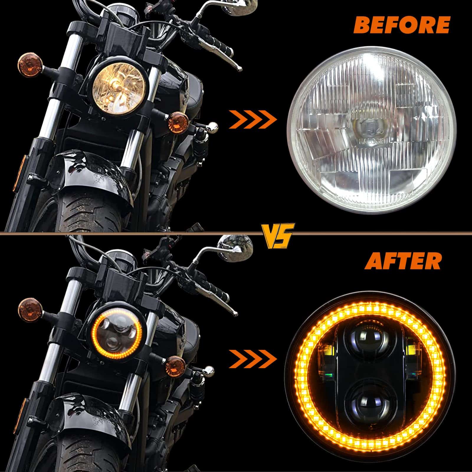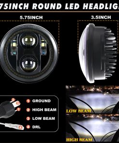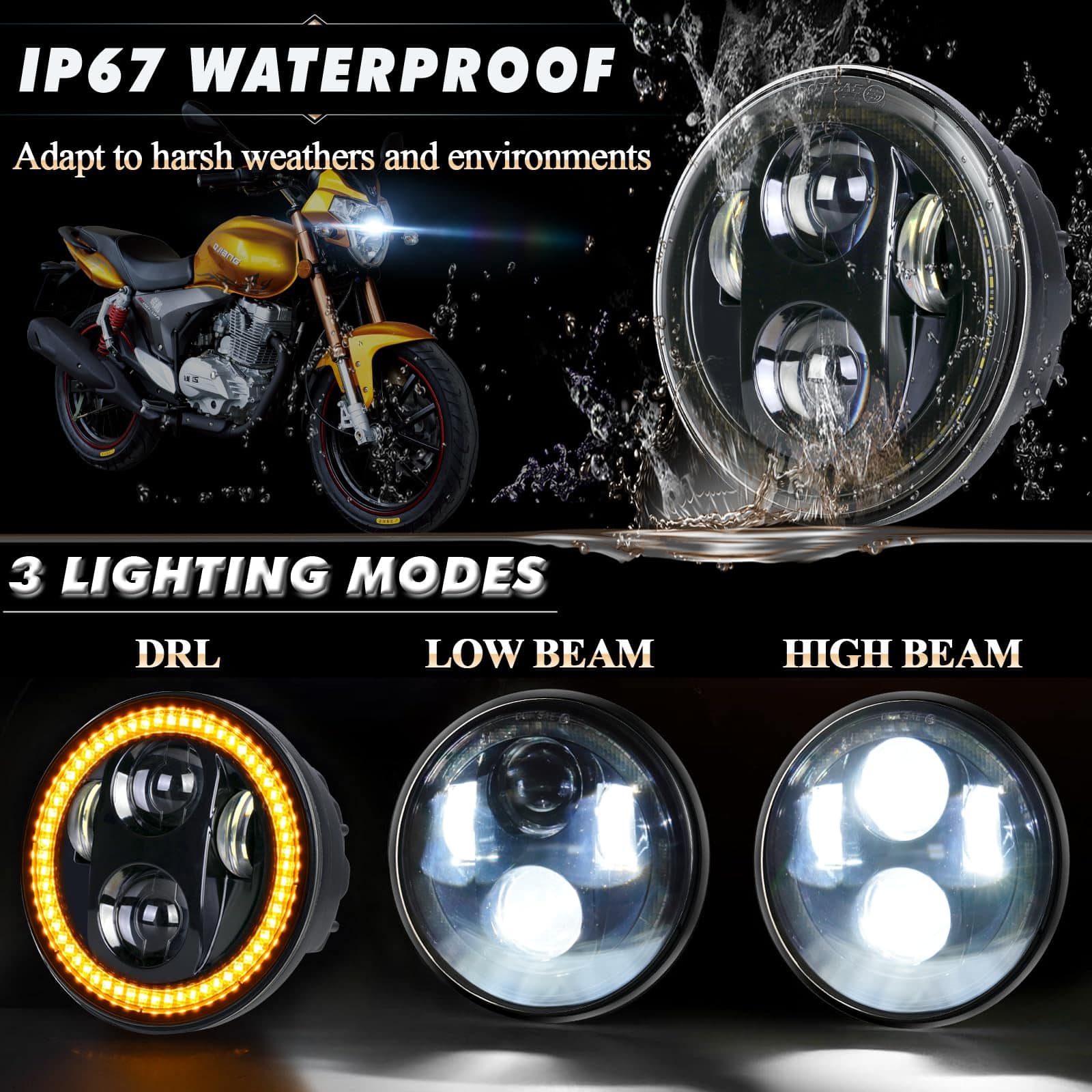Faros delanteros LED de 5,75 pulgadas redondos con halos de humo AMBAR DRL para motocicletas. Diseñados con material duradero de alta calidad que incluye chips LED para una mayor luminosidad, aleación de aluminio premium para una disipación rápida del calor y lente de policarbonato resistente a los arañazos, el óxido y la corrosión. Fáciles de instalar con conector H4 Plug & Play y adaptador de faros incluido. Incluye manual de instalación. Servicio de atención al cliente disponible las 24 horas.