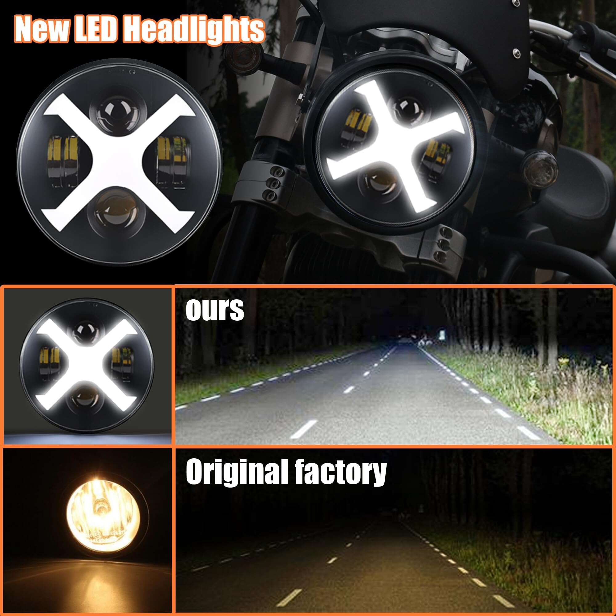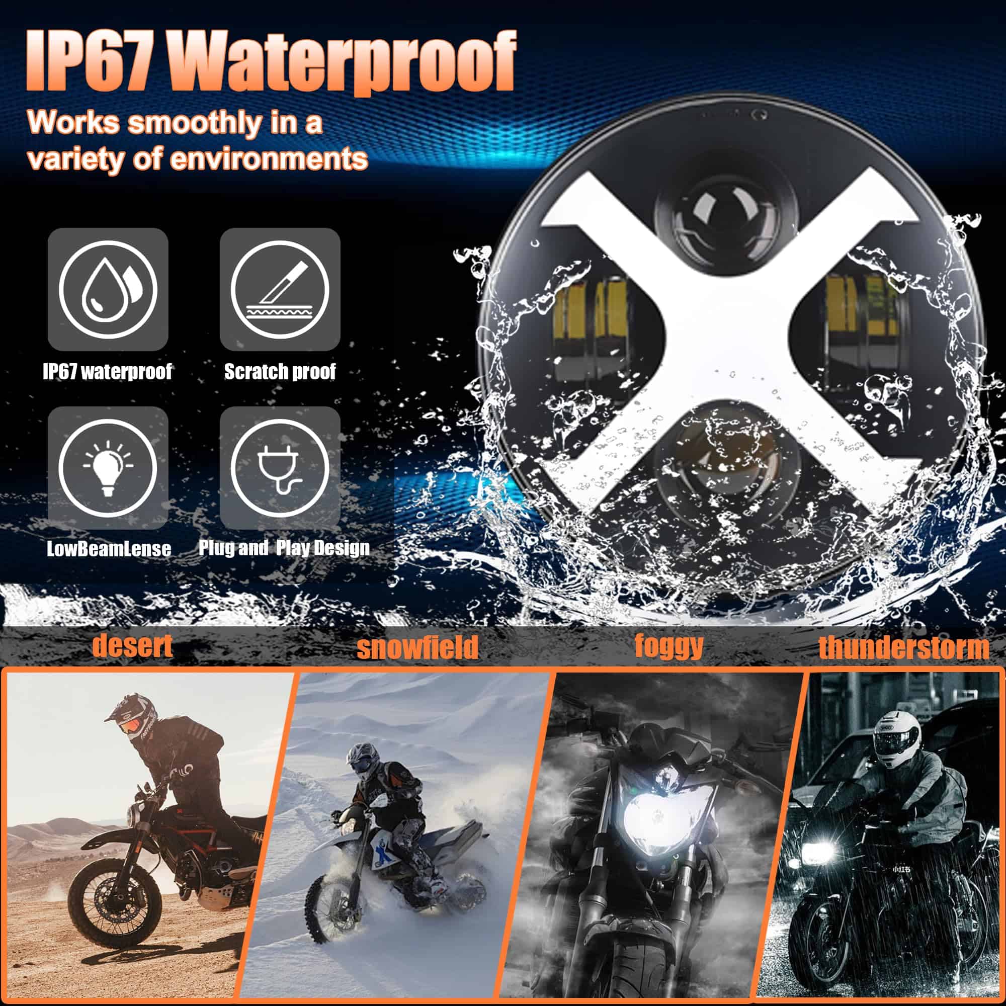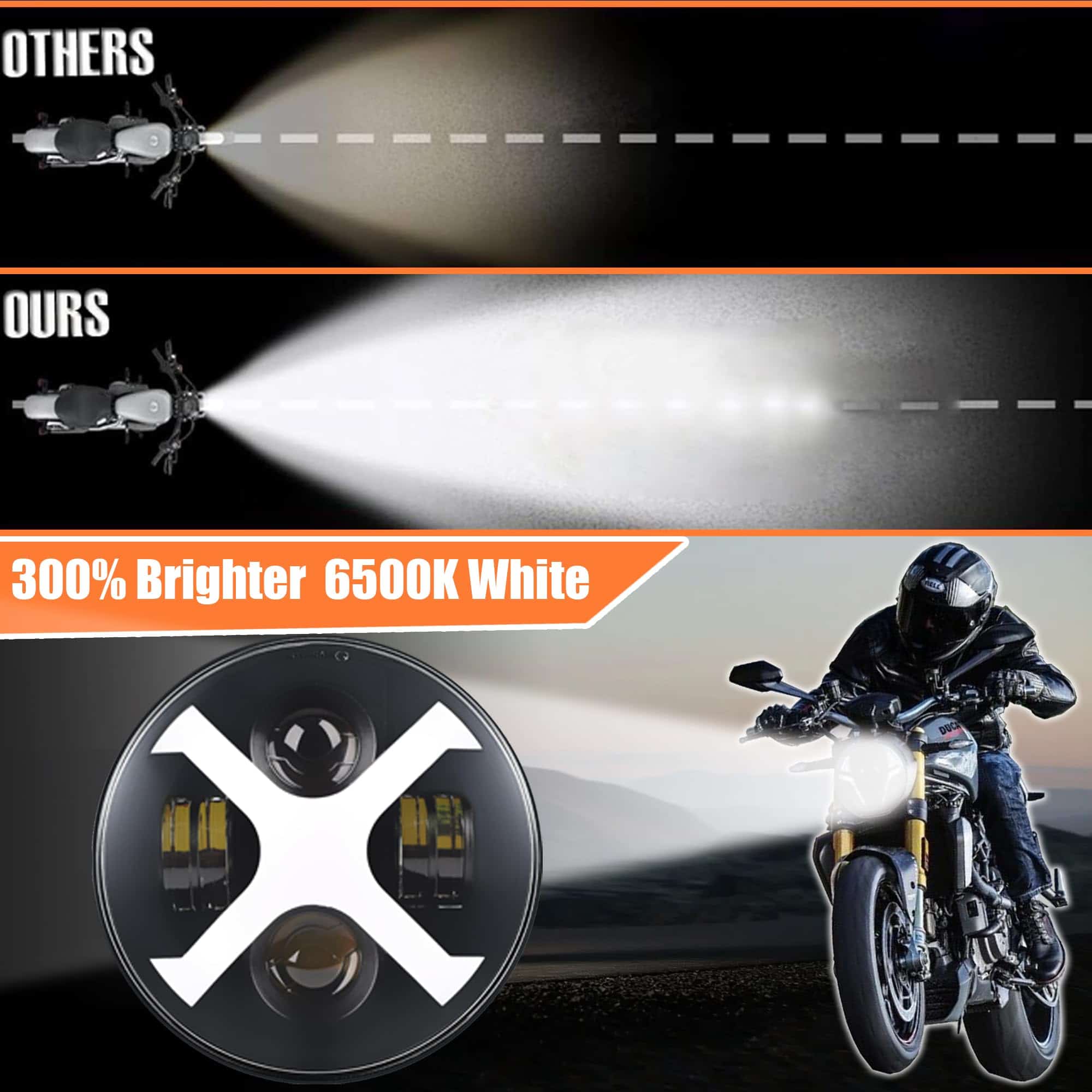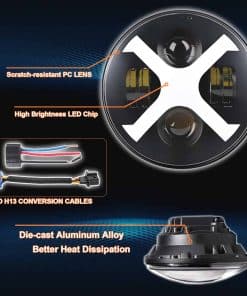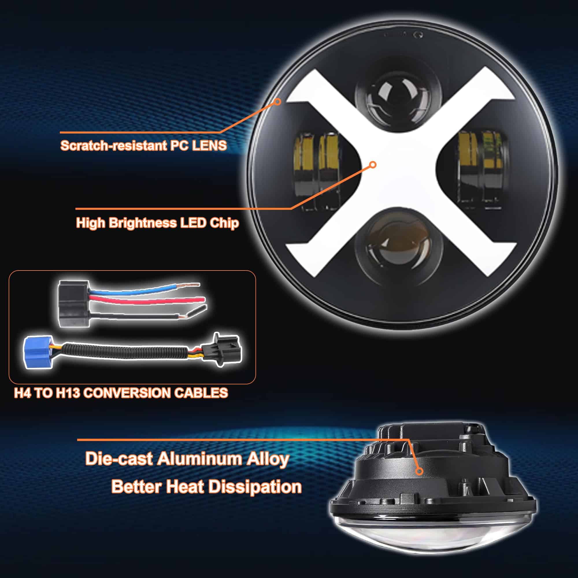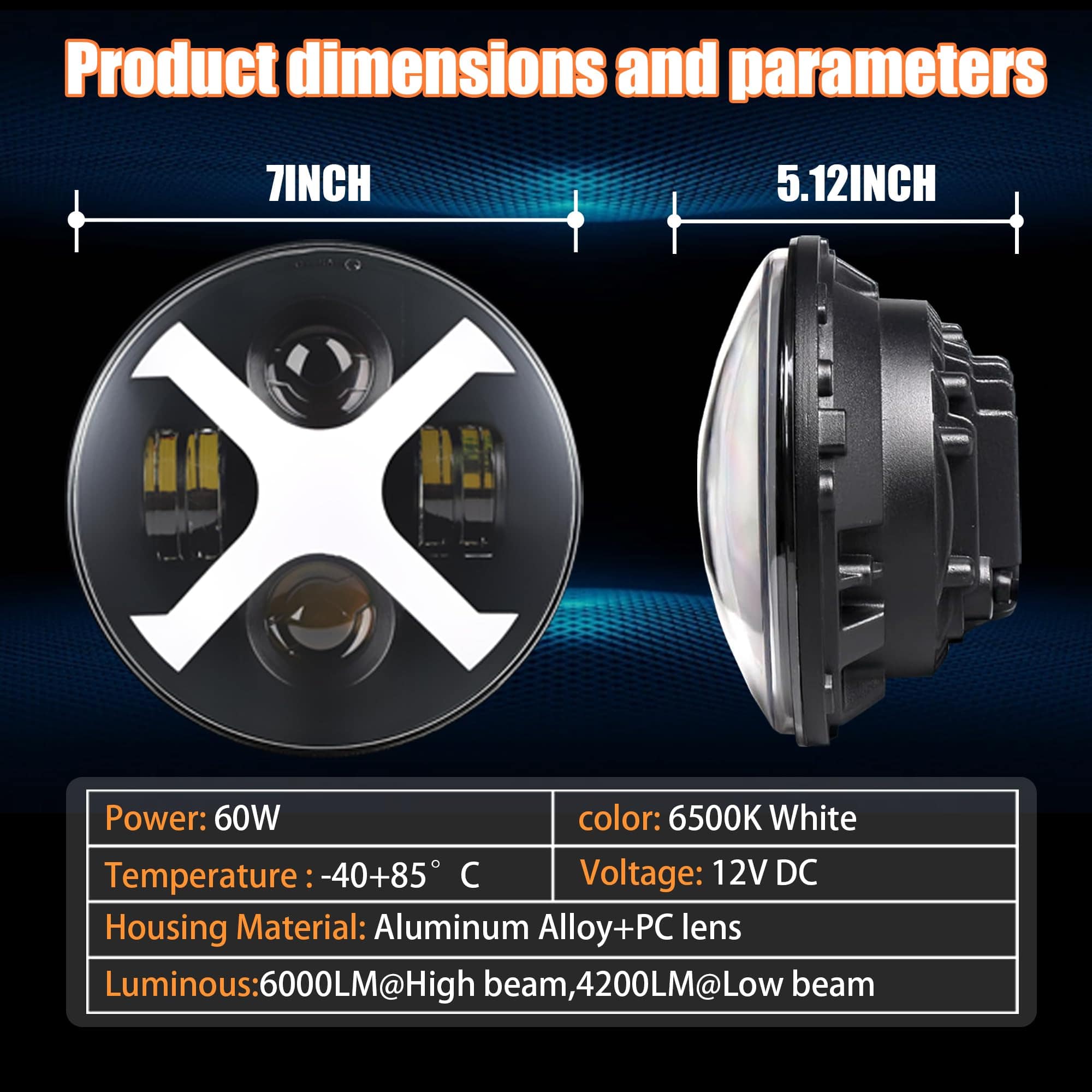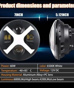 Los faros delanteros de motocicleta de 7 pulgadas LED han sido diseñados con materiales de alta calidad y una excelente disipación de calor para una larga vida útil. Incorporan luces LED de alta potencia que ofrecen un brillo máximo de hasta 6,000 lm, iluminando la carretera de manera más efectiva. Su diseño único de luces diurnas en forma de X no solo mejora la visión durante el día, sino que también agrega un aspecto dinámico y moderno a su motocicleta. Resistente al agua y ligero, puede ser utilizado en diversas condiciones climáticas sin afectar su rendimiento. Además, su instalación es sencilla y directa, adaptándose a la mayoría de las motocicletas.