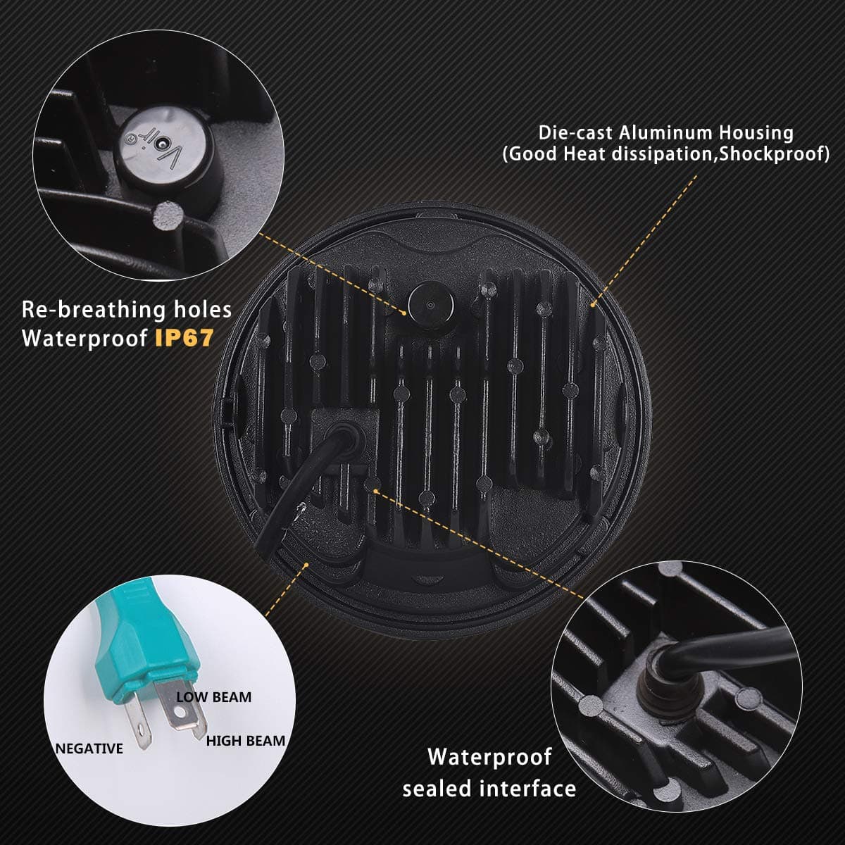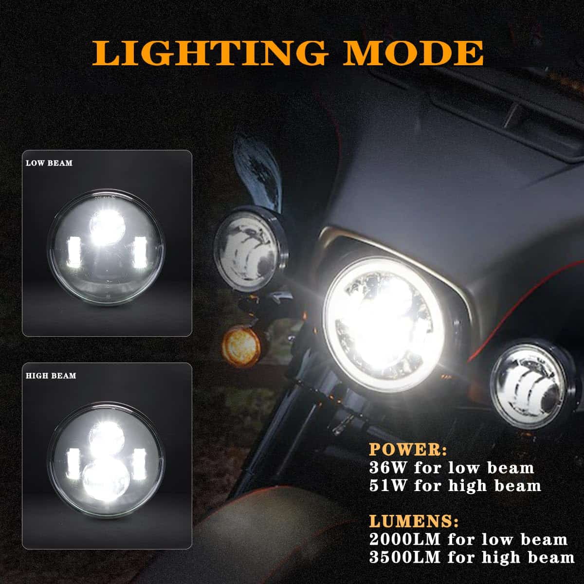 Faros delanteros doble haz de 5.75 pulgadas realmente plug-and-play, con clasificación IP67 a prueba de agua, 300% más brillante que los halógenos con una salida blanca fría de 6000K y un patrón de haz certificado por DOT, adecuado como reemplazo directo para faros LED de 5-3/4″ o 5.75″ con conexión H4 en motocicletas Harley Dyna / Softail / Sportster. Con una vida útil de 60,000 horas. Cualquier problema con este faro LED redondo de 5,75 pulgadas, no dude en contactar a AUDEXEN.