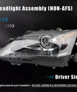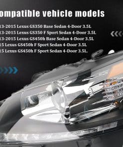 Faros LED compatibles con el lado izquierdo del conductor para Lexus GS350 GS450h 2013 2014 2015 3.5L. Este producto es un reemplazo para los números de parte 81185-30F80, 8118530F80 y LX2502161. Compatible con varios modelos de Lexus, como GS350 Base Sedan 4 puertas 3.5L 2013-2015, GS350 F Sport Sedan 4 puertas 3.5L 2013-2015, GS450h Base Sedan 4 puertas 3.5L 2013-2015, GS450h F Sport Sedan 4 puertas 3.5L 2015, GS450h F Sport Sedan 4 puertas 3.5L 2015 (NO AFS). Los faros están fabricados con materiales de alta calidad que ofrecen un buen sellado, resistencia a impactos y resistencia a altas temperaturas, lo que los hace aptos para diversos entornos de trabajo desafiantes y proporcionan una mejor visibilidad en la carretera. Es importante destacar que los faros no incluyen bombillas y estas deben comprarse por separado. Este producto es compatible con vehículos que cuentan con lámparas HID/xenón sin faros AFS, no siendo compatible con vehículos que tienen faros adaptativos o con sistema de visión nocturna. Los faros han sido sometidos a rigurosas inspecciones y pruebas para garantizar que el instalador pueda utilizarlos directamente tras recibirlos. La instalación de piezas nuevas puede mejorar la experiencia de conducción y asegurar una conducción segura.