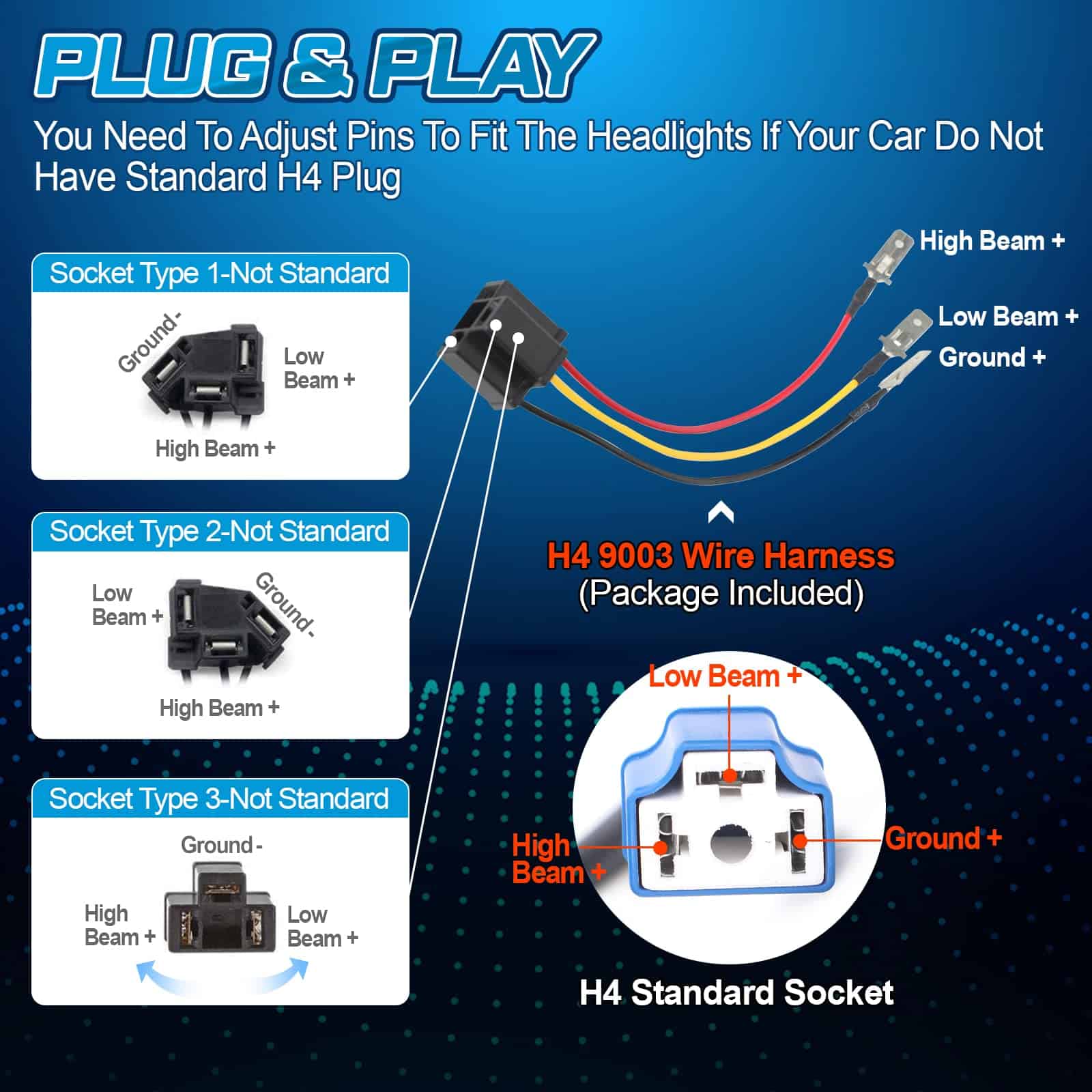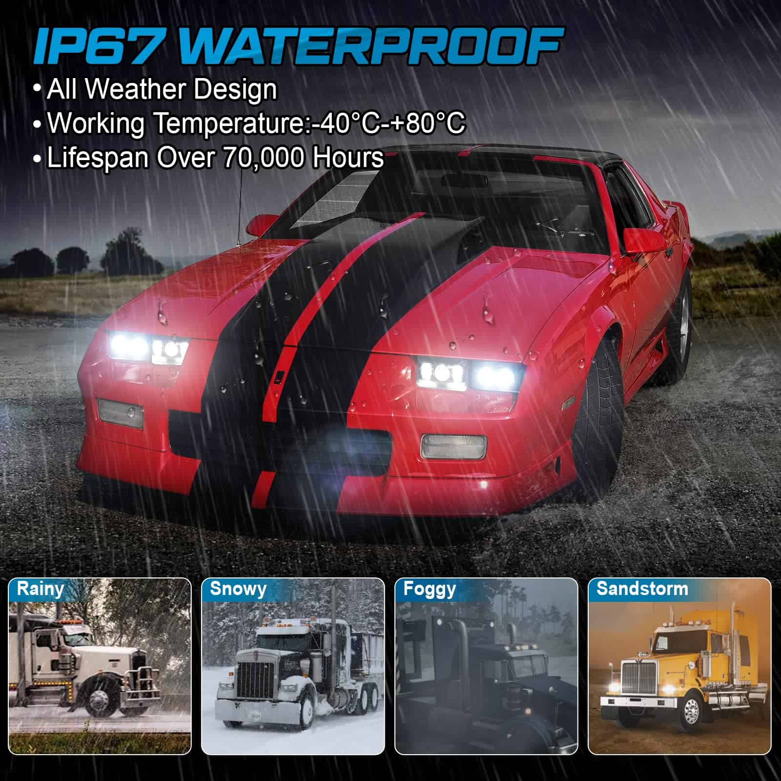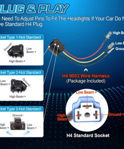 Tipo de faro: H4651 H4652 H4656 H4666 H4668 H6545 Compatible con: 1978 – 1983 American Motors Concord; 1980 – 1988 American Motors Eagle; 1979 – 1983 American Motors Spirit 1975 – 1990 Buick Electra; 1976 – 1986 Buick LeSabre; 1982 – 1987 Buick Regal; 1975 – 1985 Buick Riviera 1975 – 1985 Cadillac Eldorado; 1975 – 1985 Cadillac Seville 1982 – 1992 Camaro; 1982 – 1987 Cavalier 1982 – 1987 El Camino 1980 – 1988 Monte Carlo 1979 – 1986 Ford Mustang 1993 – 1997 Ford Probe 1982 – 1992 Camaro Iroc-Z 1976 – 1987 Pontiac Grand Prix 1987 Silverado V10 Freightliner FLD120 112 FLD Peterbilt 379 378 357 Especificación: Voltaje: 9 ~ 32 V Temperatura de color: 6500K/Blanco Potencia: 45W @ Baja intensidad, 60W @ Alta intensidad Lúmenes: 3400 LM @ Baja intensidad, 6000 LM @ Alta intensidad Paquete incluido: 2 faros LED de alta intensidad de 4×6 pulgadas Beam 2pcs 4×6 pulgadas Faros LED de baja intensidad 4pcs Adaptador H4 a 3 pines