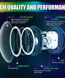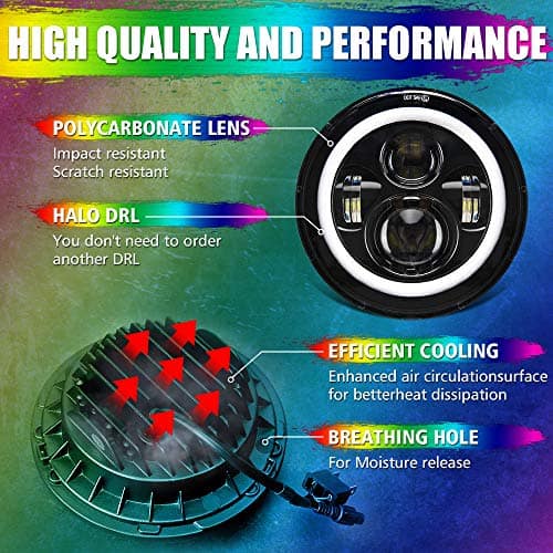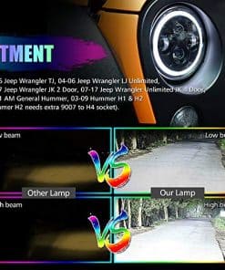 3. Faros LED RGB JK Reemplaza los faros halógenos e HID originales, libre de mantenimiento, resistente al agua IP67, Nuevo diseño fantástico de faros LED con ojos de ángel DRL reemplaza los faros halógenos e HID originales. Salida de lúmenes de funcionamiento: 4200 LM (luz alta), 3200 LM (luz baja), resistente al agua IP67, voltaje de funcionamiento: 10-32V CC.