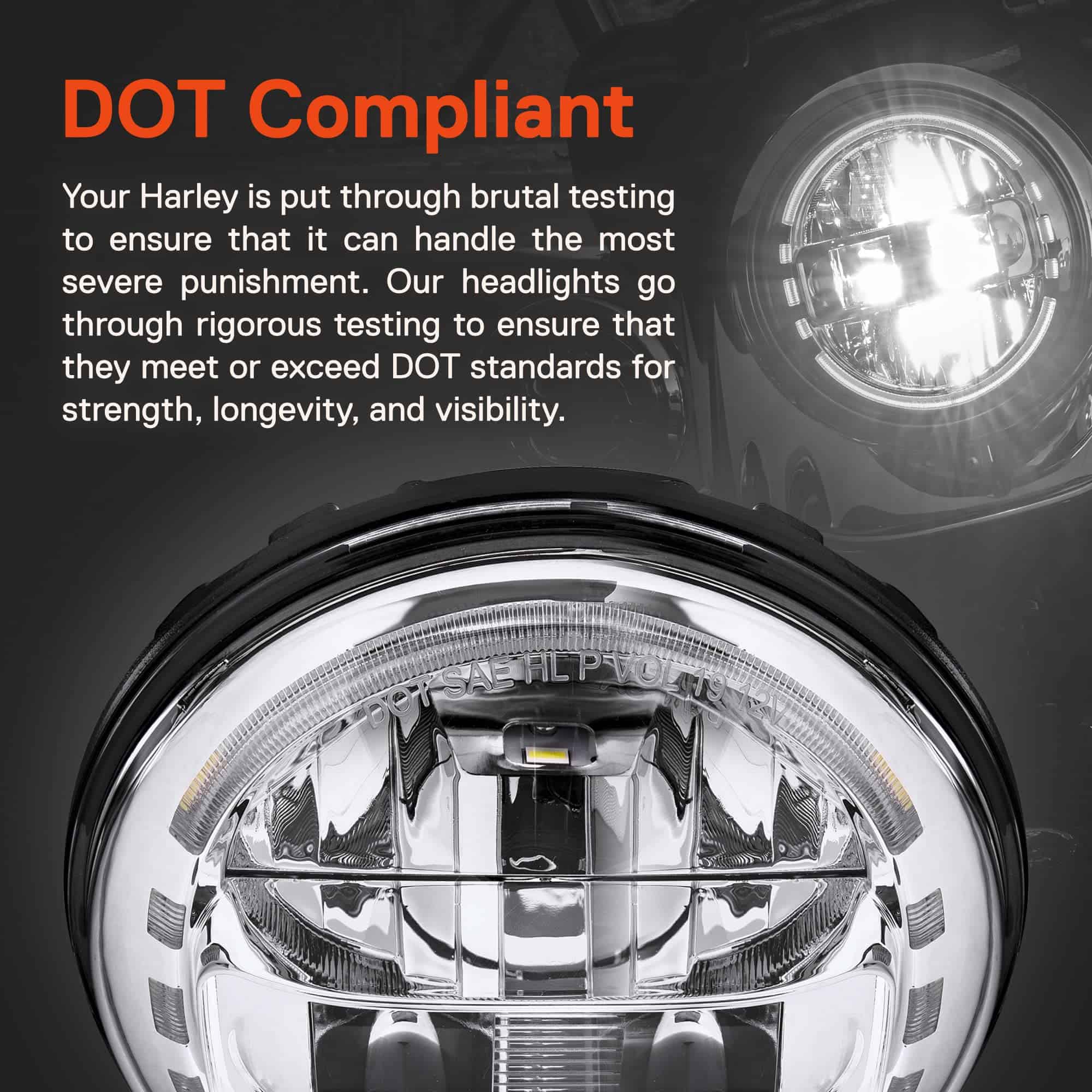 Nacido Para la Grandeza Infinitamente personalizable, ferozmente único y siempre reconocible, tu moto es tu orgullo. Deja que tu estilo brille con este faro LED de 7″ para tu Harley Davidson. Con un diseño dinámico, un halo DRL blanco penetrante y opciones de cara en negro o cromo, estos faros te acercan un paso más hacia convertir tu moto en la leyenda que nació para ser. Conquista Todo Nada detiene a una Harley, no el calor, no la lluvia, ni siquiera las montañas. ¿Por qué tu faro debería ser diferente Como tu moto, nuestros faros están diseñados para llevarte donde quieras ir. El cuerpo de aluminio duradero, el disipador de calor integrado y el puerto de eliminación de humedad protegen la electrónica de tu luz, mientras que la lente con clasificación de impacto desvía los escombros del camino como si ni siquiera estuvieran allí. Dulce Simplicidad ¿Buscas un buen rato de calidad en el garaje con tu moto No arruines un buen momento con piezas que no encajan correctamente. Con un adaptador CANbus integrado para eliminar el parpadeo en las motos más nuevas, dos arneses de adaptadores que cubren cada modelo de Harley y un soporte de montaje a juego de color, nuestros faros incluyen todo lo que necesitas para una instalación suave y sin problemas. Qué está Incluido (1) Faro Redondo de 7″ para Harley Davidson Soporte de Montaje – CROMO (1) Soporte de Montaje del Faro (1) Manual de Instrucciones (1) Kit de Faro HALO DRL DOT Aprobado HDL1553 de 7″ para Harley Davidson – CROMO (1) Faro de 7″ (1) Convertidor H4-H11 (1) Convertidor H4-4 Pin (1) Cable de Extensión Rojo de 39″ con Conector (1) Manual de Instrucciones