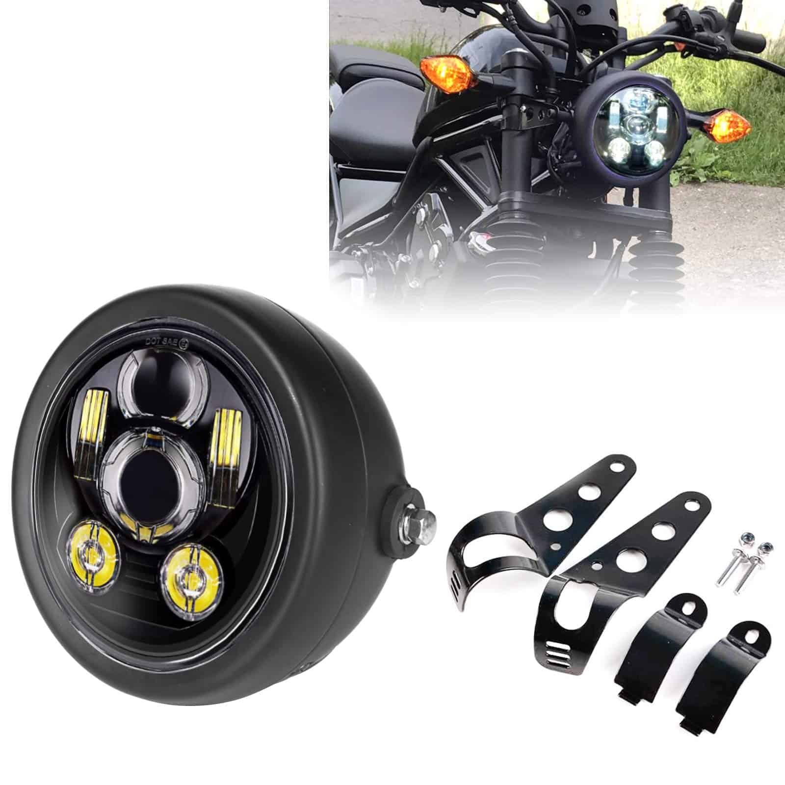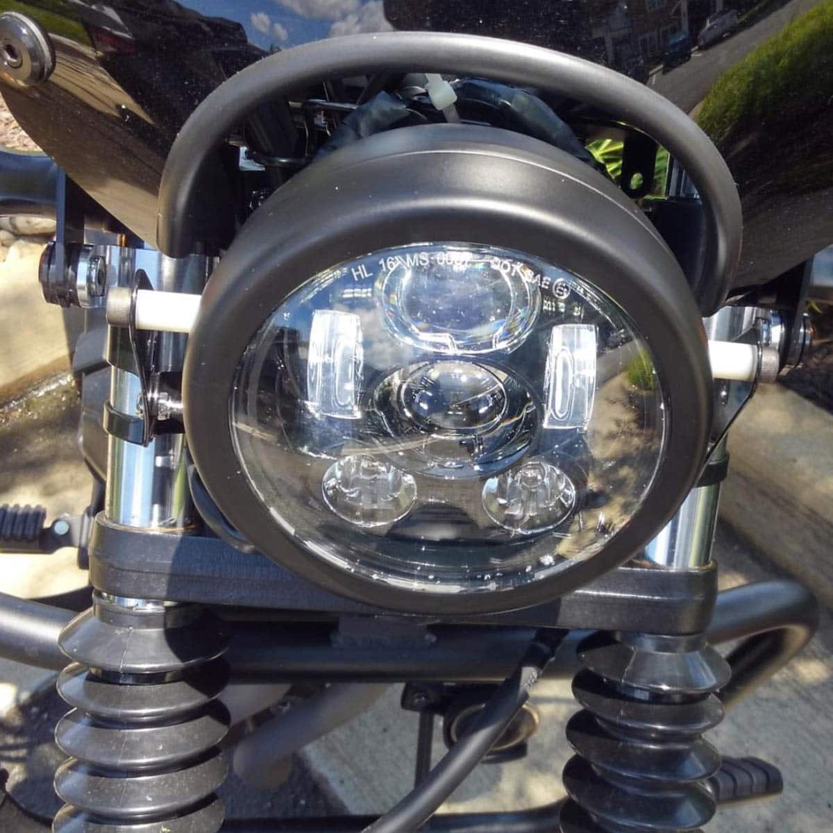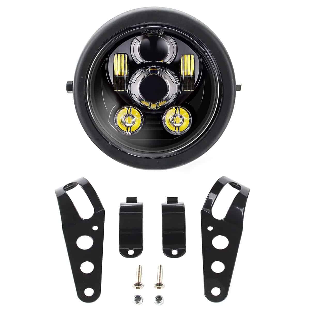 1. DOT SEA aprobado Faro LED Sellado de 5.75 pulgadas para motocicletas con carcasa de faro, legal en la carretera, se adapta a la mayoría de los amortiguadores de 1.26-1.6 pulgadas de diámetro de motocicletas (Si sus Tubos de Horquilla son más grandes que 1.6 pulgadas, por favor contáctenos para el soporte de montaje más grande);