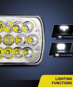 Especificación: Potencia LED: 15PCS 3W, luz alta 45W, luz baja 18W; Lúmenes: luz alta 5600LM, luz baja 2500LM; Voltaje de funcionamiento: 9-30V DC (compatible con vehículos de 12V, 24V) Vida útil de trabajo: Más de 30,000 horas Temperatura de color: Blanco puro 6000K-6500K Material de la carcasa: Aleación de aluminio fundido a presión Material de la lente: PMMA; Tasa impermeable: IP67; Aplicaciones: 1. Compatible con faros: H6014 H6052 H6054 6054 H5054 H6054LL 69822 6052 6053 2. Compatible con la mayoría de los vehículos que tienen faros de fábrica de 7×6 /5×7. Modelos Jeep: Jeep Wrangler YJ 1987-1995 Jeep Cherokee XJ 1984-2001 Jeep Comanche MJ Modelos GMC: GMC Savana 3500 (1998-2002 2004 2007 2009-2012) GMC Savana 2500 (1998-2001 2004 2006 2008 2010-2012) GMC Savana 1500 (1998-2001 2003 2005 2007 2009-2012) GMC Safari (1998-2002 2004 2005) GMC K3500 / K2500 / C2500 (1997-2000) GMC K1500 / C1500 (1997-1999) GMC K2500 / K1500 / C2500 / C1500 Suburban (1997-1999) Modelos Ford: Ford F-550 / F-450 / F-350 Super Duty Ford E-350 / E-250 Econoline Ford E-150 Club Wagon Modelos Chevrolet: Chevrolet Express 3500 Chevrolet Express 1500 Chevrolet Astro Atención 1. Algunos vehículos pueden tener un tipo de conector de 3 pines no estándar y es posible que deba reorganizar los pines en el enchufe del faro a diferentes posiciones o simplemente agregar un adaptador adicional de H4 a 3 pines. 2. Si su vehículo es una serie Toyota con tierra dual, puede haber casos en los que solo funcione un haz. En este caso, necesitaría agregar un juego de arnés de cableado de relé de 2 faros H4. 3. Si la parte trasera de su faro tiene un espacio limitado, se requiere alguna modificación del soporte del faro. Paquete incluye: 2 faros LED 45w 7×6 5×7