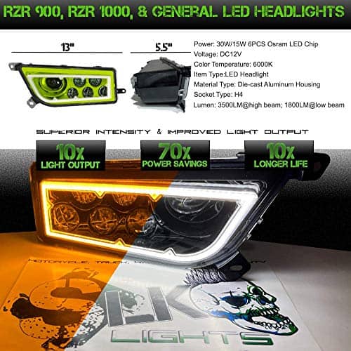 Faros LED POLARIS RZR con Halo LED de Doble Color. Halo Negro y Ámbar para Señales de Giro Opcionales (Requiere un Kit de Señales de Giro, No incluido). Arnés incluido para los modelos RZR 1000 y RZR 900. 6 CREE XTE LED CHIP, Potencia LED: 30W/20W, Voltaje de Funcionamiento: 10-30V DC, Temperatura de Funcionamiento: -40 C ~ 60 C, Lumenes: 4800LM en luz alta / 3500LM en luz baja, Tasa de impermeabilidad: IP 67, Color de la carcasa: NEGRO, DRL / Color del Halo: Negro / Ámbar, Temperatura de color: 6000K, Material: Carcasa de aluminio fundido, Material de la lente: Lente de policarbonato duradero Vida útil de la lente: Promedio de 50000 horas. Tipo de variación: (Halo Negro y Ámbar) Para evitar que el color de la carcasa se desvanezca, mantenga cubierto al almacenar. COMPATIBILIDAD – POLARIS 2014-2021 RZR XP 1000, 2014-2021 RZR XP 4 1000, 2015-2021 RZR 900, 2016-2021 RAZOR XP TURBO, 2016-2021 RAZOR XP 4 TURBO, 2016-2019 POLARIS GENERAL 1000 Side by side.