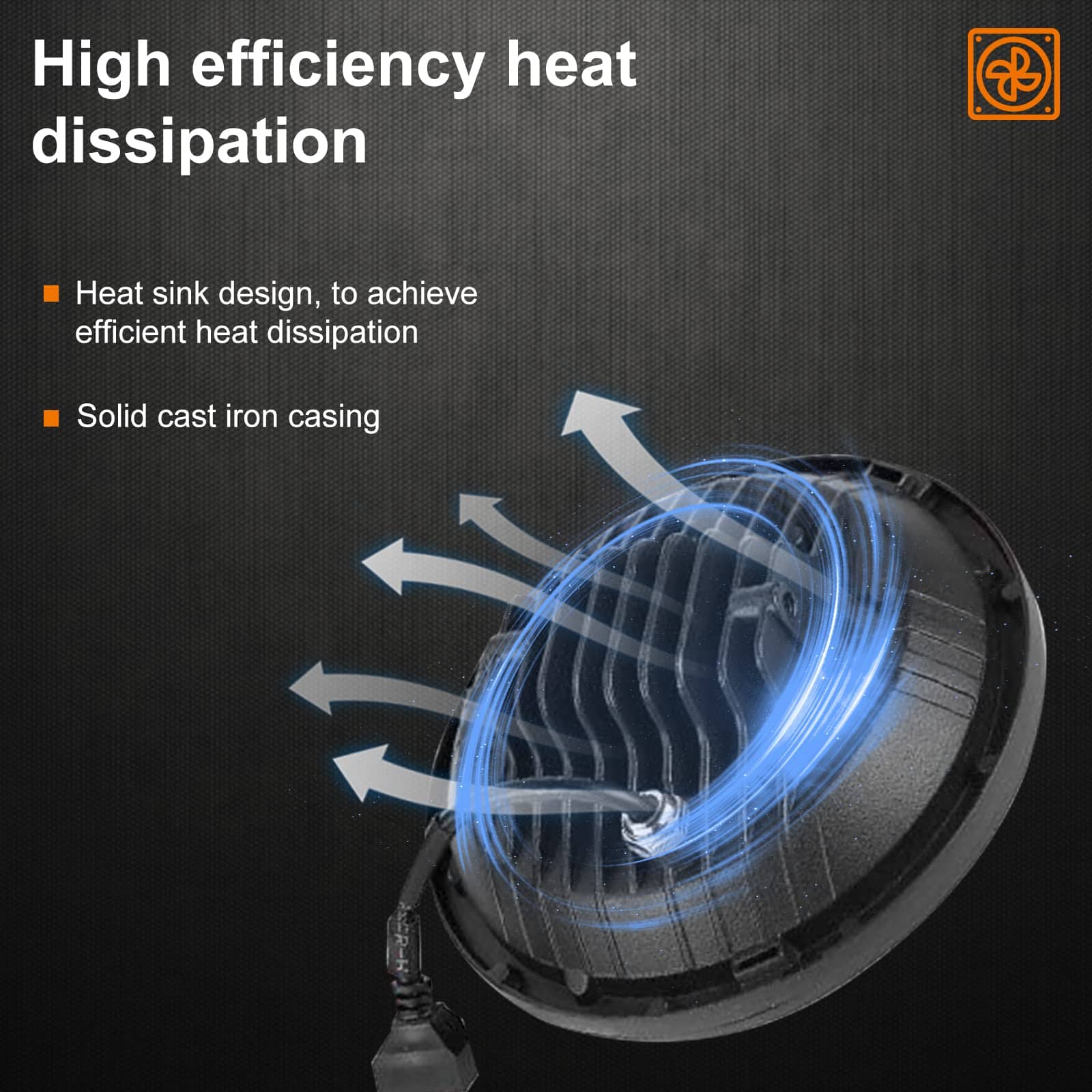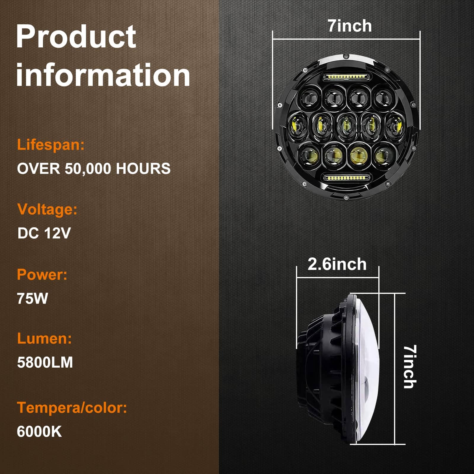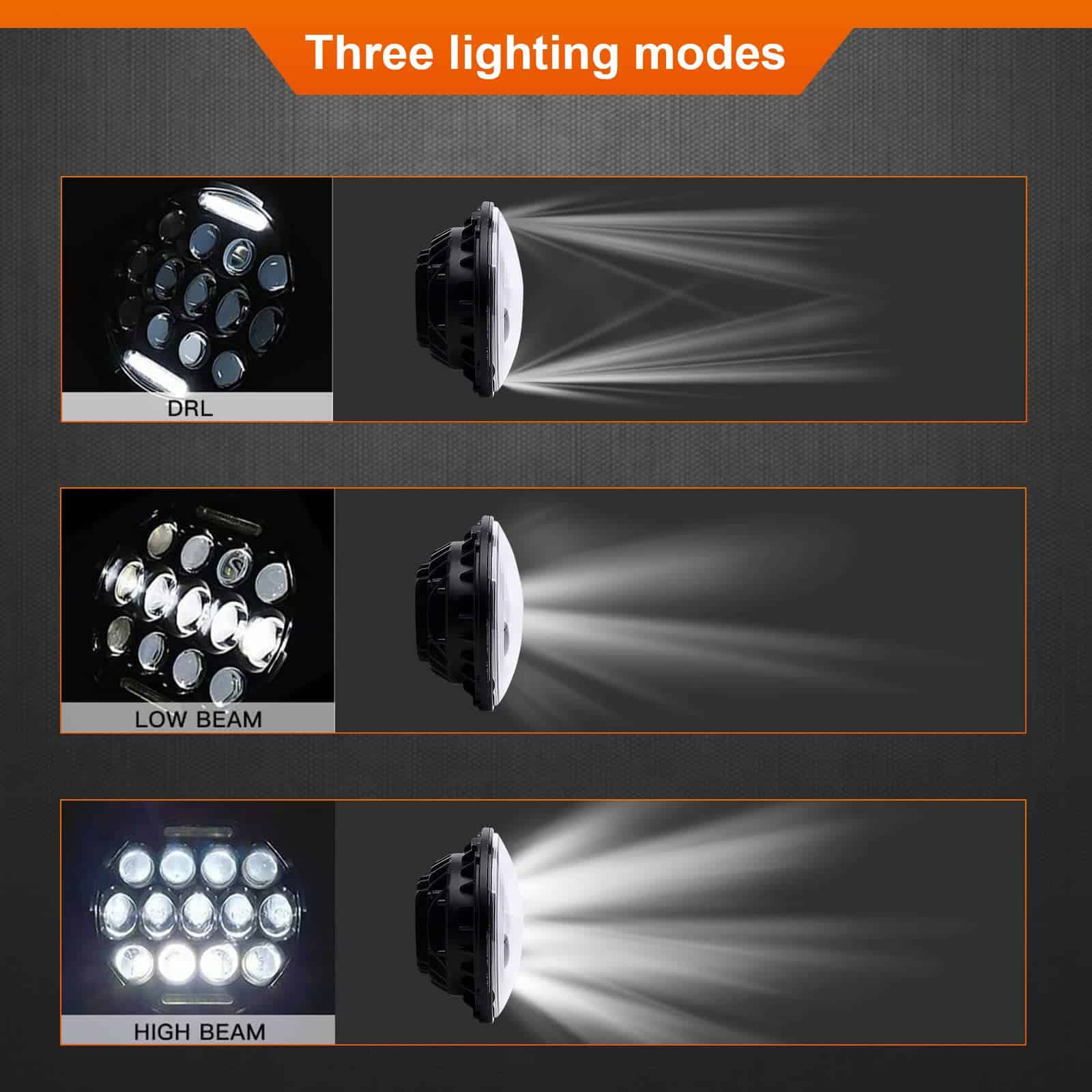 1. ¡SUPAREE BRILLANTE! Bombilla de faro LED de 7 pulgadas de 75W que reemplaza el faro halógeno y HID original, libre de mantenimiento, resistente al agua IP67, salida de lumens en operación: 5800 LM (Luz Alta), 2900 LM (Luz Baja), Voltaje de operación: 9-32V CC. Reemplaza el faro halógeno y HID original, libre de mantenimiento, más de 50000 horas de vida útil.