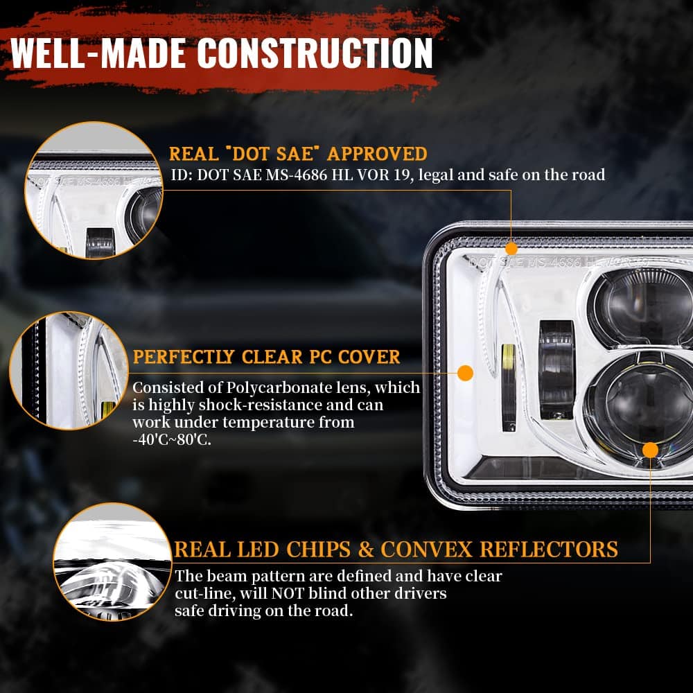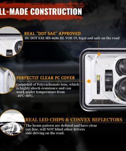 Compatible con: Vehículos con faros de 4X6 pulgadas como: Kenworth T800 T400 T600 W900B W900L Classic 120/132 HK Classic, Freightliner fld 120 112, Faros rectangulares Peterbilt 379 378 357, Chevy K5 K10 K20, Trans Am.