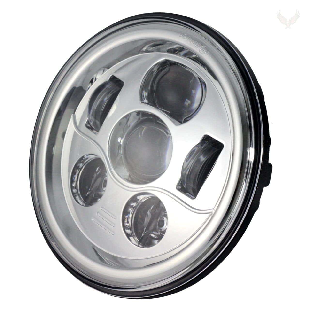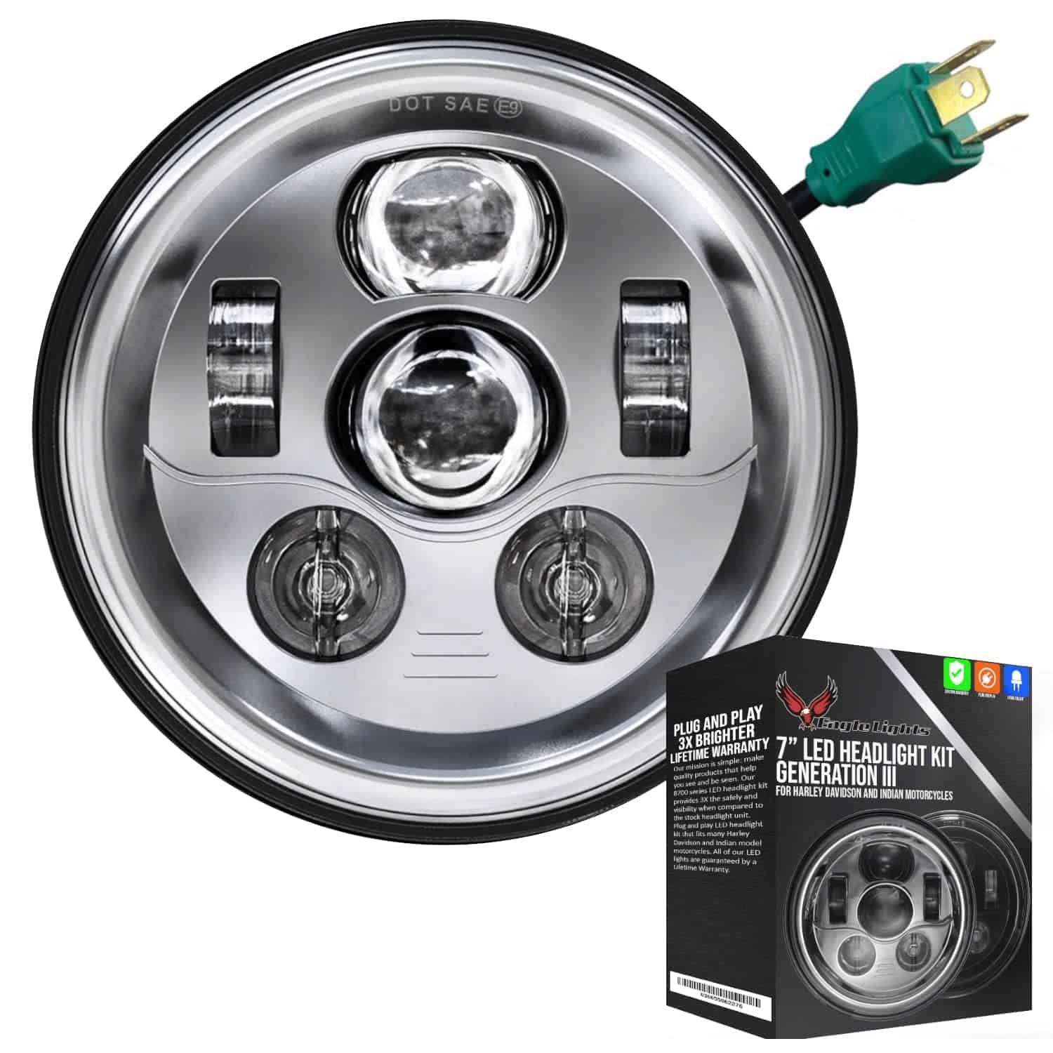 El Eagle Lights Generación III es el faro LED de 7″ más nuevo y brillante disponible. Cuenta con un 33% más de potencia que la Generación II con un patrón de haz más amplio. Viene con un acabado cromado limpio para complementar tu moto. Fácil instalación plug and play con un enchufe H4 de 3 clavijas estándar de la industria. Transforma la conducción nocturna en una experiencia más segura y fácil. Proyección de ángulo ancho y una temperatura de color por encima de 6000K hacen que la carretera sea brillante y fácilmente visible. No se necesita cableado adicional. Utiliza el enchufe estándar de la motocicleta para conectar.