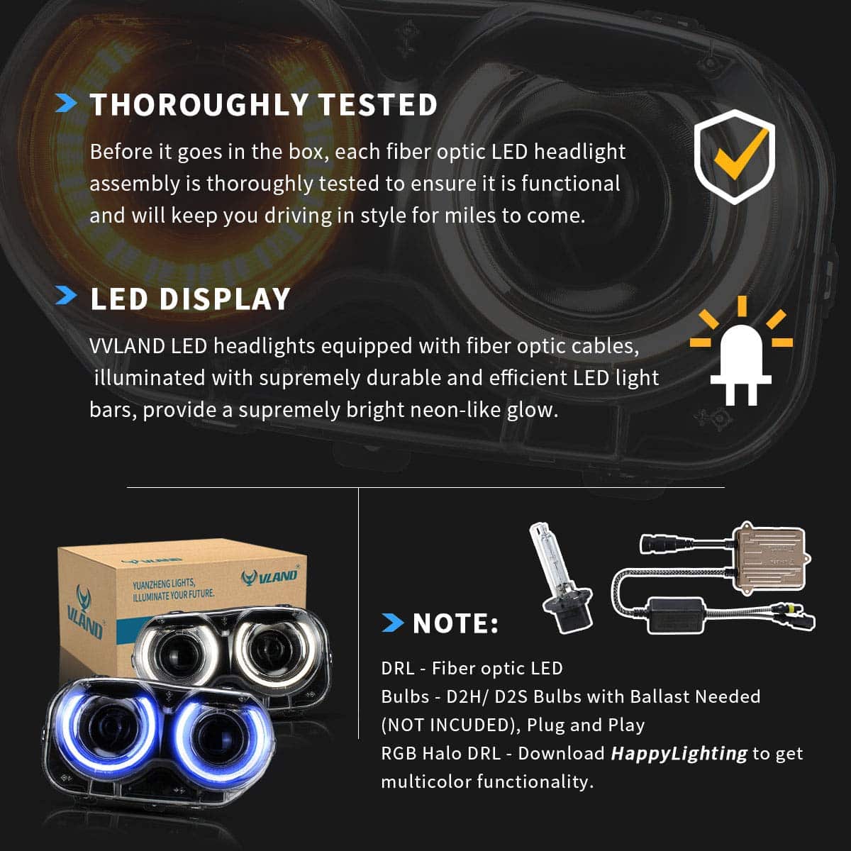 Nota: Bombillas no incluidas, se necesitan bombillas de xenón D2H/D2S con balasto. Por favor, siga el manual para descargar la aplicación llamada HappyLighting para obtener la funcionalidad multicolor. NO COMPATIBLE CON: MODELOS CON FAROS ORIGINALES HID/XENÓN. Cuidado con los cambios de modelo a mitad de año. Contáctenos con imágenes de su vehículo si necesita ayuda con los códigos de modelo. Se recomienda una instalación profesional. El paquete incluye un juego completo de faros (lado del conductor y del pasajero). Compatible con los siguientes vehículos Dodge Challenger 2015-2019, excepto modelos con faros originales HID. Especificaciones: Bombillas: bombillas de xenón D2H con balastos O bombillas led de base mini D2S para luces altas/bajas. Resistente al agua: IP67. Homologación: DOT. Voltaje de funcionamiento: 12V 42W. Funciones: DRL, RGB DRL, doble haz y luz de giro. Color de la carcasa: Negro. Color de la lente: Transparente. Material de la carcasa: Plástico ABS. Material de la lente: PC. Tipo de ensamblaje: Original sellado. VLAND es el fabricante líder especializado en el diseño y fabricación de accesorios para automóviles modificados. Productos principales: Luces LED modificadas, parachoques, parrillas. Nos comprometemos a diseños únicos originales al 100%, alta calidad y precios competitivos.